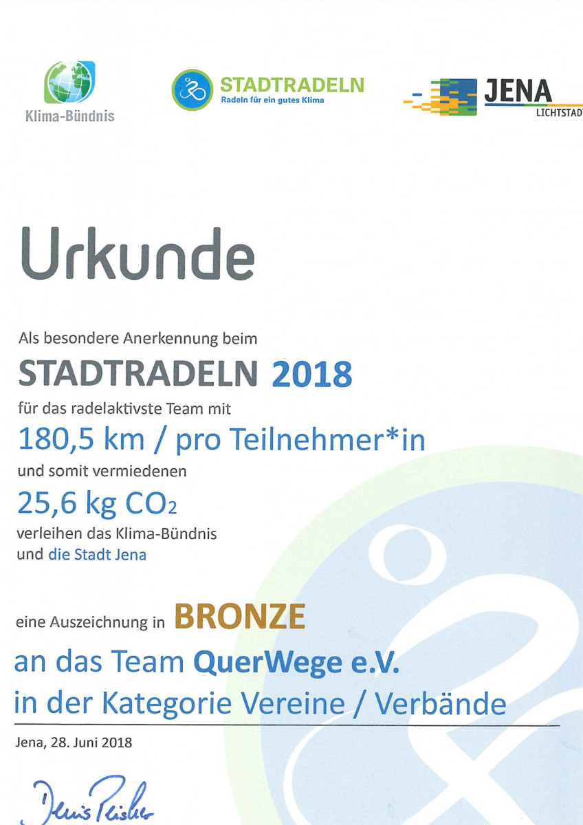In den letzten 21 Tagen radelten wir und ließen alle nachweislich an unseren Kilometern teilhaben.QuerWege hat sich mit 180,5 km pro Teilnehmer_in Bronze erradelt. Vielen Dank an alle Mitradler_innen die für ihre Gesundheit radelten, an den Klimaschutz ganz groß dachten und für mehr Lebensqualität sorgen in Jena.