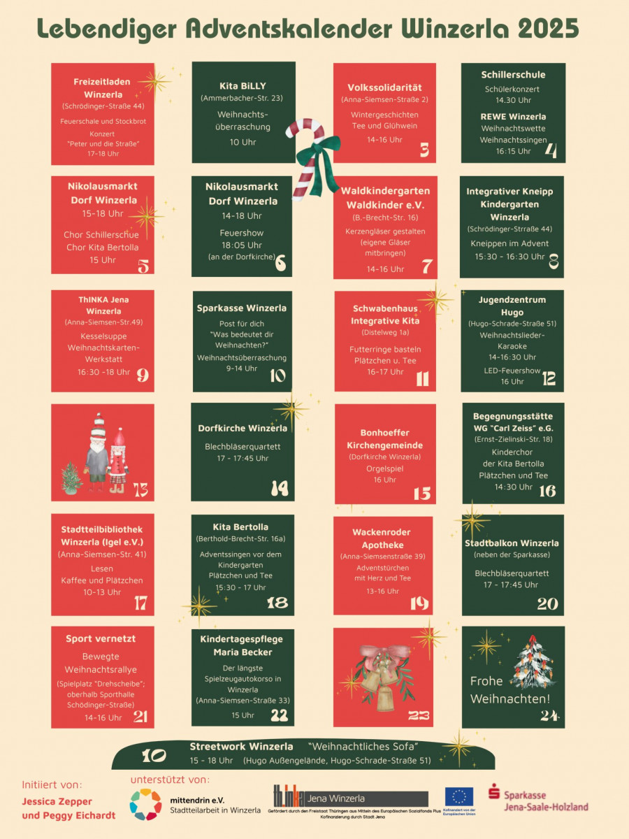 In Winzerla startete die Erstauflage des »Lebendigen Adventskalenders«. An 21 Adventstagen findet jeweils eine kleine Aktion in Winzerla statt – mal ist es etwas Musikalisches, mal was zum Mitmachen oder es wird etwas Kulinarisches angeboten. Es geht darum, Einrichtungen und Initiativen in Winzerla kennenzulernen, um offene Türen, Willkommen-Sein, Sich-Begegnen und Kontakte-Knüpfen. Neben der Kita BiLLY, die schon am 2. Dezember eingeladen hatte, macht auch das Schwabenhaus bei dieser Aktion mit. Die Schwabenhäusler*innen wollen gemeinsam Futterkringel basteln, singen, Plätzchen essen und ins Gespräch kommen. Dafür haben die Kinder im Wohngebiet schon fleißig liebevoll gestaltete Einladungen verteilt und freuen sich auf viele Besucher*innen am 11.12.