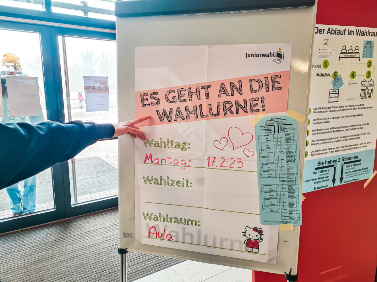 Am 17.02.2025 fand in der Aula der UniverSaale die Juniorwahl zur diesjährigen Bundestagswahl statt. Dafür bereitete Pädagogin Maria Birnbaum Wahlbenachrichtigungen vor und fertigte zweimal Wähler*innenlisten an. Bei der Wahl halfen Liza Marie, Selma, Jule, Chiara, Kea, Valentin, Max, Felix, Paula von der Demokratie AG der Schule aus. Sie führten nicht nur die Wahl und deren Vorbereitung durch, sondern bereiteten vorab auch Infos zur Wahl aus Wahlprogrammen auf.