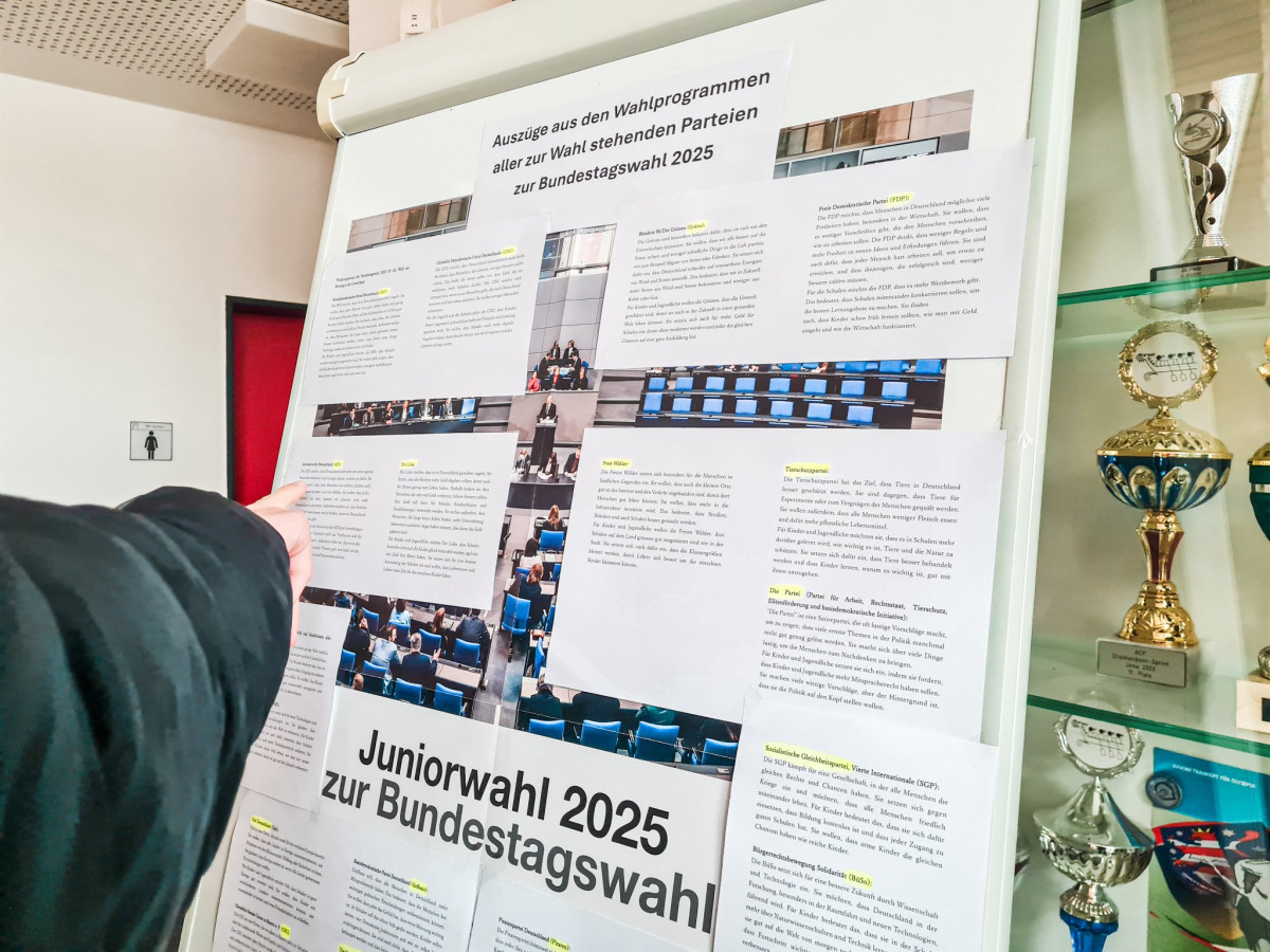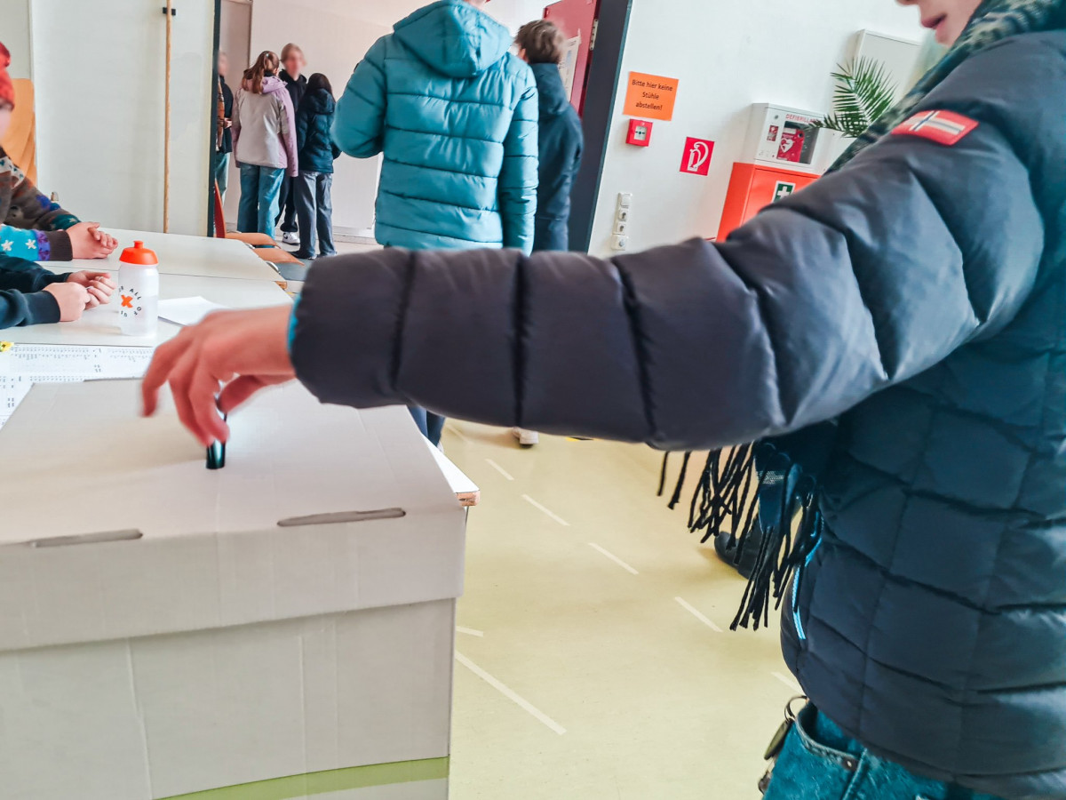 Im Morgenkreis wurden die Schüler*innen über die Juniorwahl informiert und Wahlbenachrichtigungen verteilt. Im Foyer lief zur Vorbereitung auf die Wahl ein kurzes Video mit der Erklärung zur Bundestagswahl. Dies managte Schulsozialarbeiterin Sandy Halle.