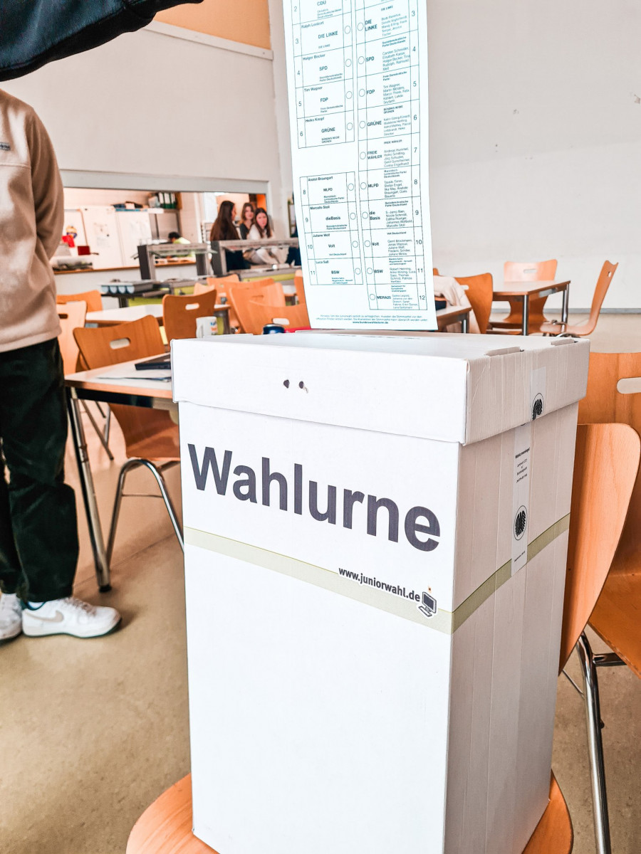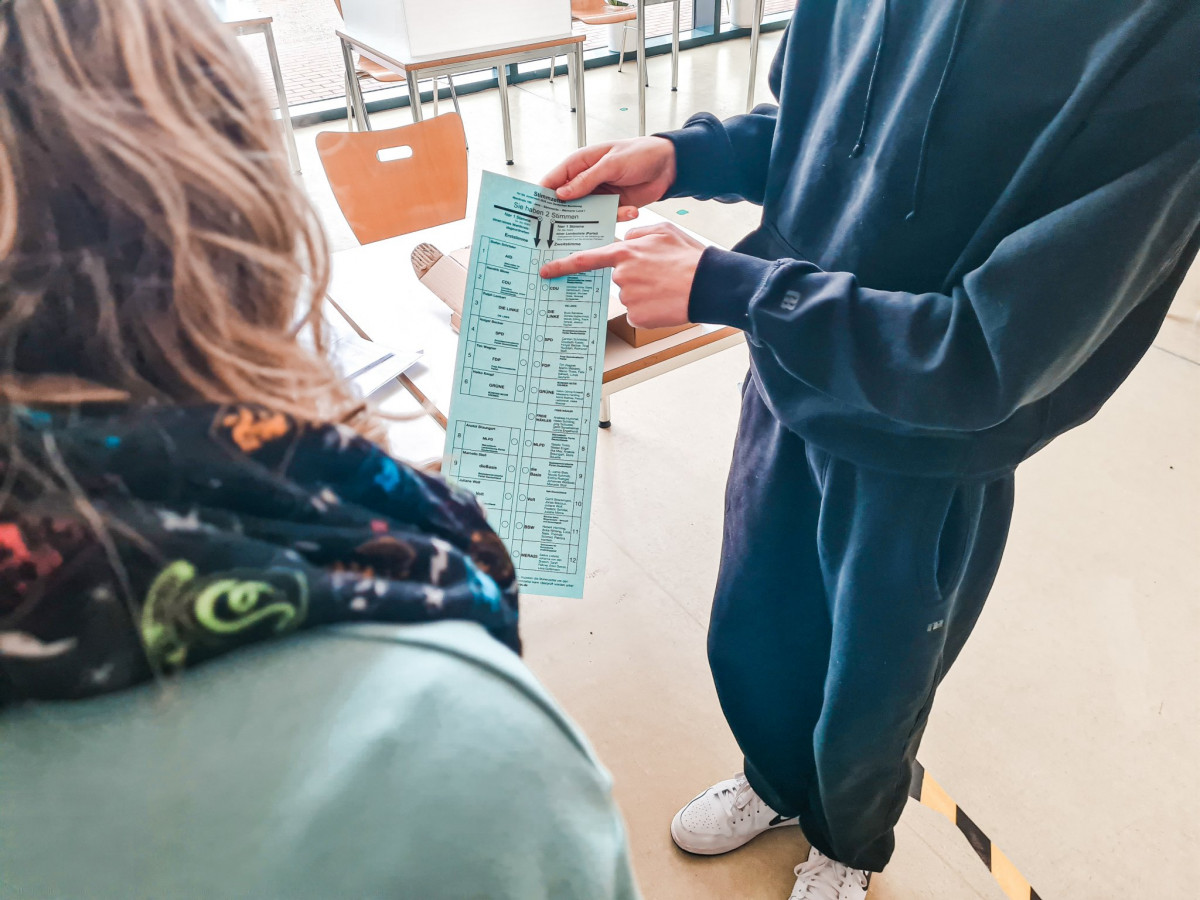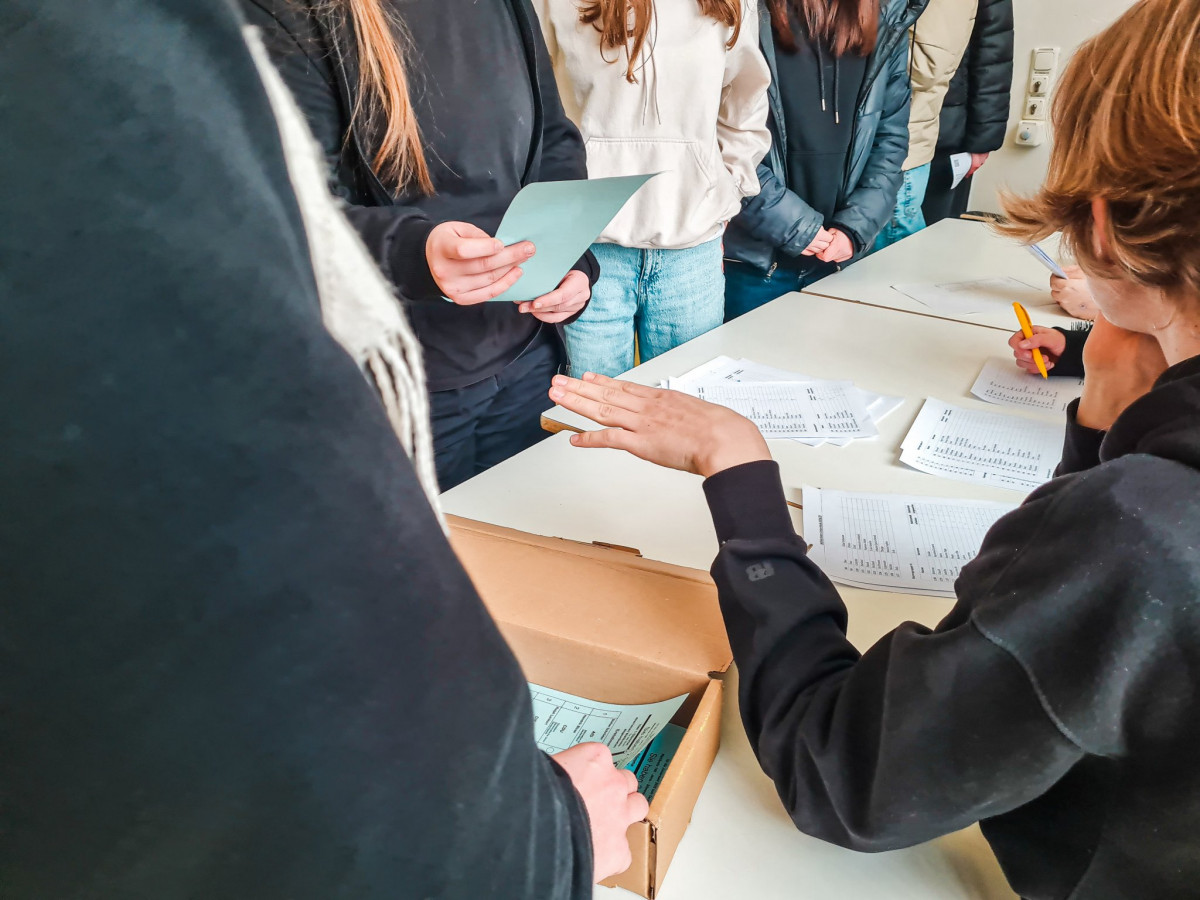 Der Aufbau des Wahllokals in der Aula begann an Montag um 7:30 Uhr, sodass um 08:00 Uhr die Juniorwahl starten konnte. Die Schüler*innen konnten von der 1. bis zur 5. Stunde ihre Stimmen abgeben. Das 1. Team der Wahlhelfer*innen übernahm den Einlass und gab ein paar Infos zur Wahl. Team 2 sammelte die Wahlbenachrichtigungen der Schüler*innen ein. Anschließend sorgten sie für die Verteilung Stimmzettel und kreuzten die Namen der Kinder und Jugendlichen auf den Wählerlisten ab. Die Aufsicht im Wahllokal übernahm das 3. Team. Jeder gab nach der Wahl bei Team 4 seinen Stimmzettel ab und anschließend wurde Name des*r Schüler*in abgehakt.