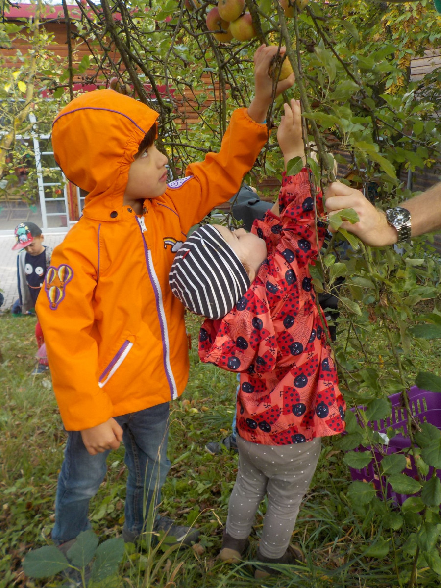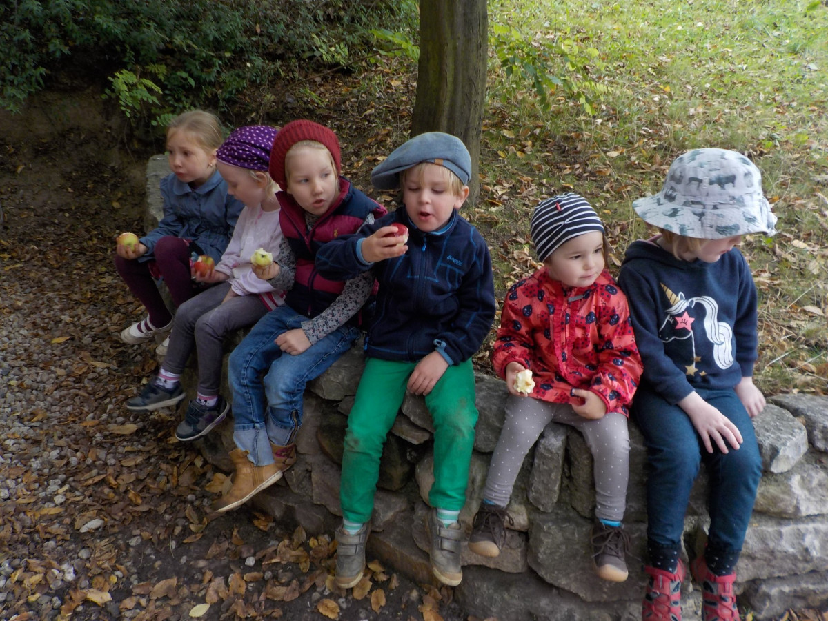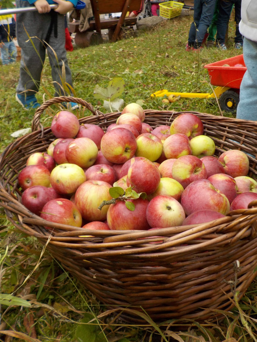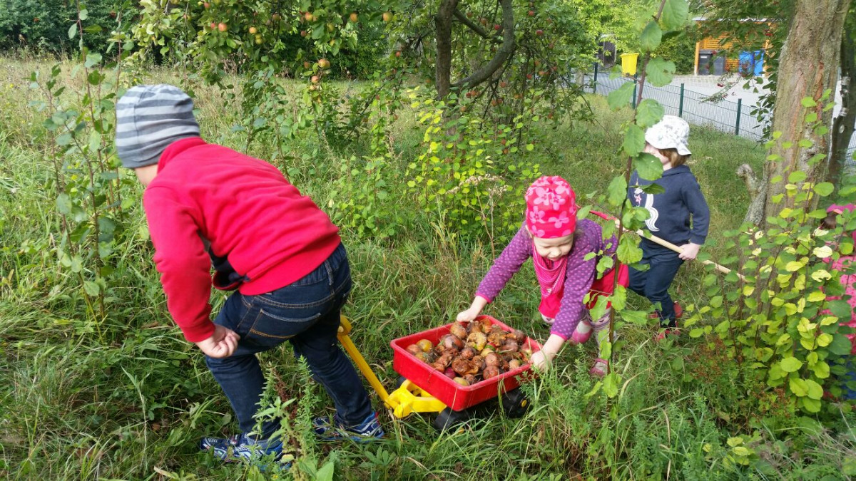 Heute haben wir angefangen Äpfel aus unserem Garten zu ernten. Gemeinsam haben wir zuerst die faulen Äpfel aufgelesen und entsorgt. Danach konnten wir Äpfel pflücken, die Bäume kräftig schütteln und alle runtergefallenen Äpfel einsammeln. Das war ganz schön anstrengend. Da wir aber noch probieren mussten ob die Äpfel auch gut schmecken, konnten wir uns am Ende wieder stärken. Einige Kinder haben danach sogar noch Apfelmus zubereitet. Mmmh lecker!