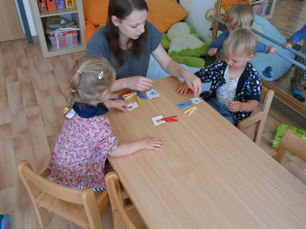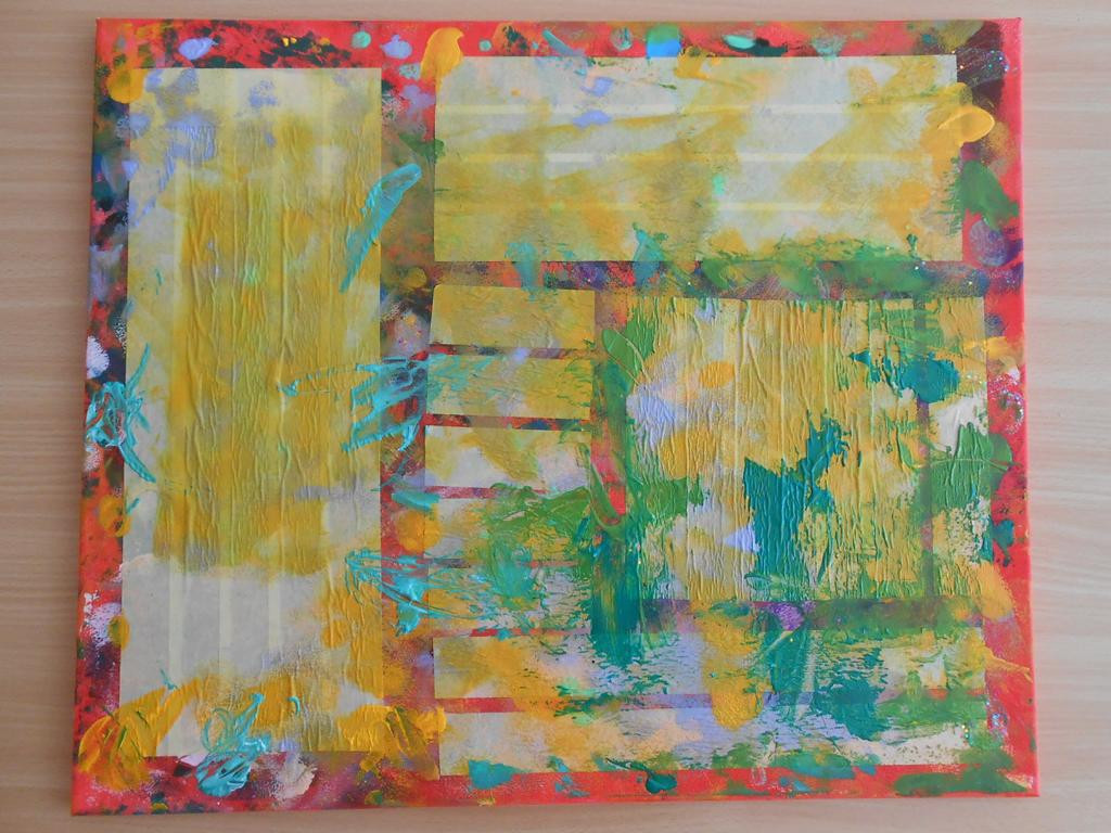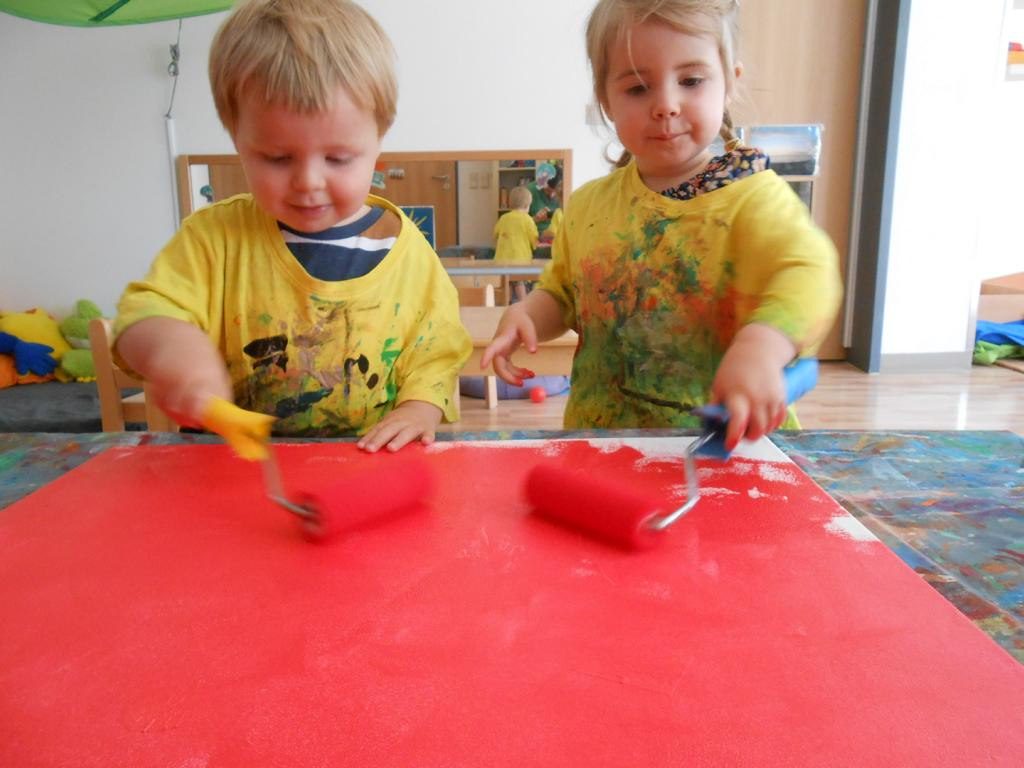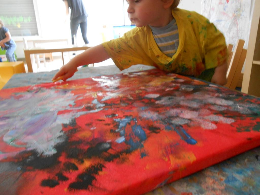 Auch die Kleinsten der Kita Pi mal Daumen erkunden im Kunstprojekt Techniken, lernen Farben kennen und zuzuordnen. Bisher haben wir die großen Fenster des Gruppenraumes mit farbigen Hand- und Fußabdrücken in eine bunte Wiese verwandelt. Natürlich darf auch die freie küstlerische Entfaltung nicht fehlen. An einem Fenster wurde mit Fingerfarben frei gemalt. Verschiedene Nagelbilder und der Beginn eines Leinwand-Tritychons sind derzeit in Arbeit. Bei Letzterem werden mittels Abklebens im Mehrschicht-Verfahren interessante Farb- und Formstrukturen gestaltet. Auch kommen neben Pinsel und Farbrolle, Löffel und Gabel als Gestaltungsinstrument zum Einsatz. Wir sind gespannt, was noch alles entstehen wird.