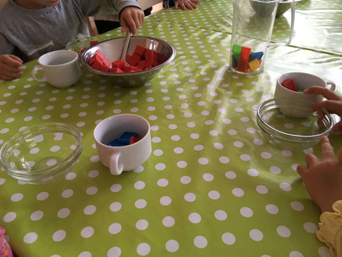Heute haben wir mit unseren jüngeren Kindern „Trockenübungen“ zum Mittagessen gemacht. Es gab leckere rote und grüne Würfel und buntes Plastik-Chipswasser. Es wurde fleißig geschöpft und geschüttet, sich besprochen und um Hilfe gefragt. So macht es uns Spaß zu Tische und es ist angenehm zu essen.