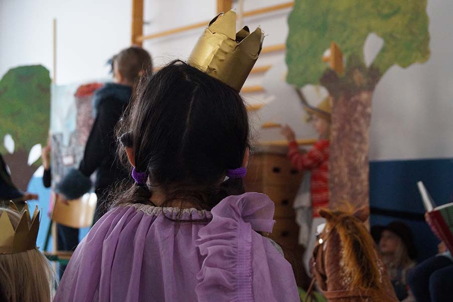 Beim Auftritt am Freitag zeigten die Kinder das Stück vor Mitschüler_innen, Eltern und Vorschulkindern aus der Kita BiLLY, die gekommen waren, um Schulluft zu schnuppern. Alle hatten an der lebendigen Vorstellung mit verschiedenen Soudeffekten, wechselnden Bühnenbildern und tollen Kostümen viel Spaß! Die Zusammenarbeit mit dem Romantikerhaus war für alle Beteiligten eine intensive und schöne Woche. Sie steht im Zeichen des Jenaer Romantikerjahres, welches die Wurzeln dieser literarischen Bewegung und deren Aktualität lebendig werden lässt.