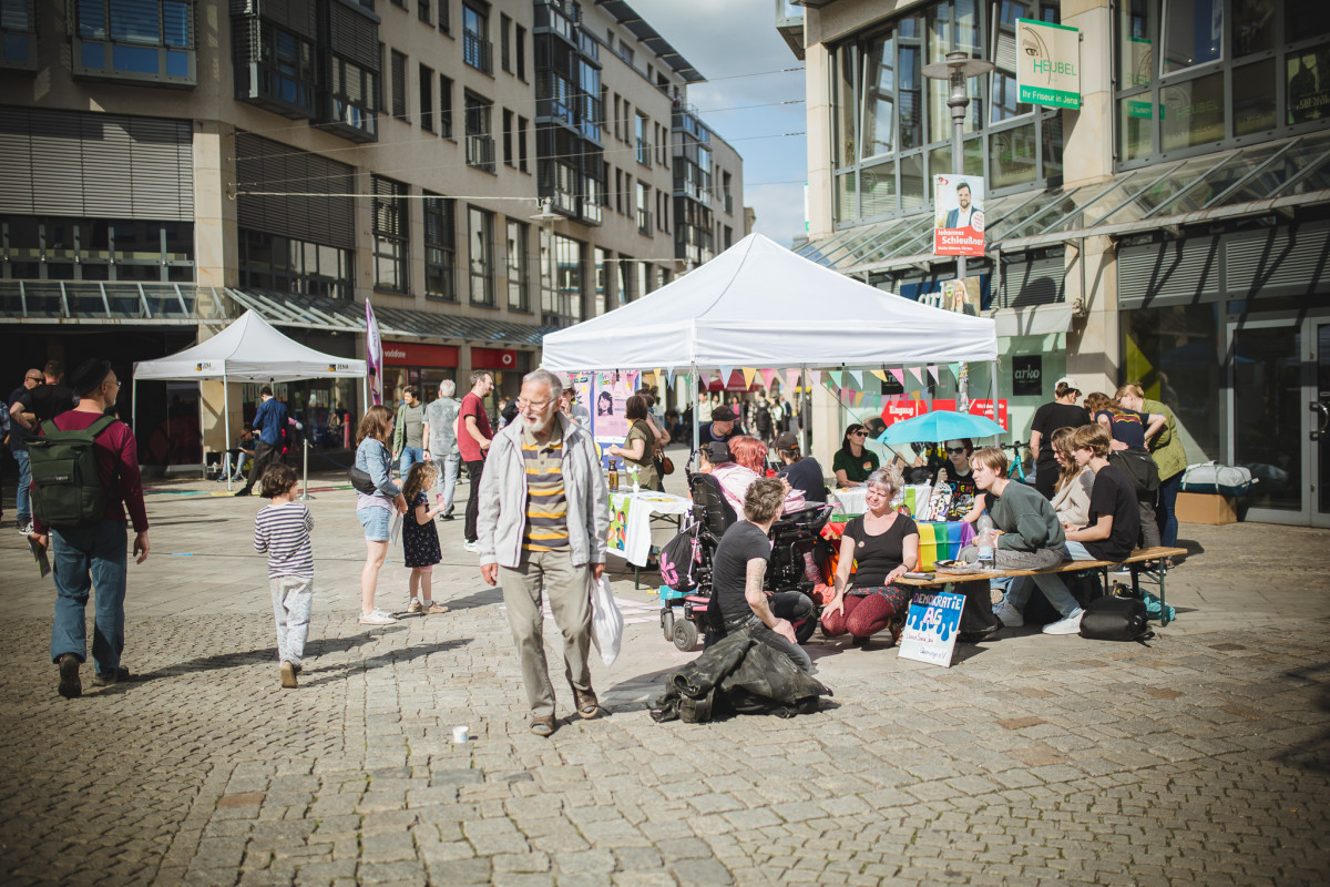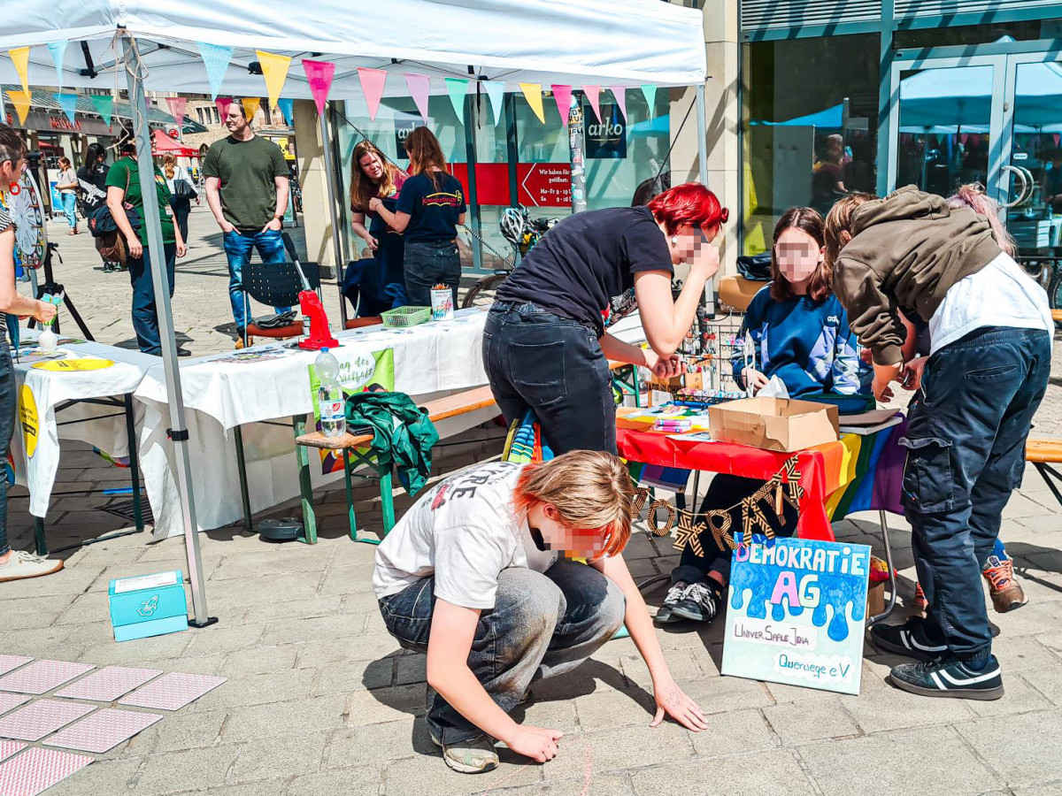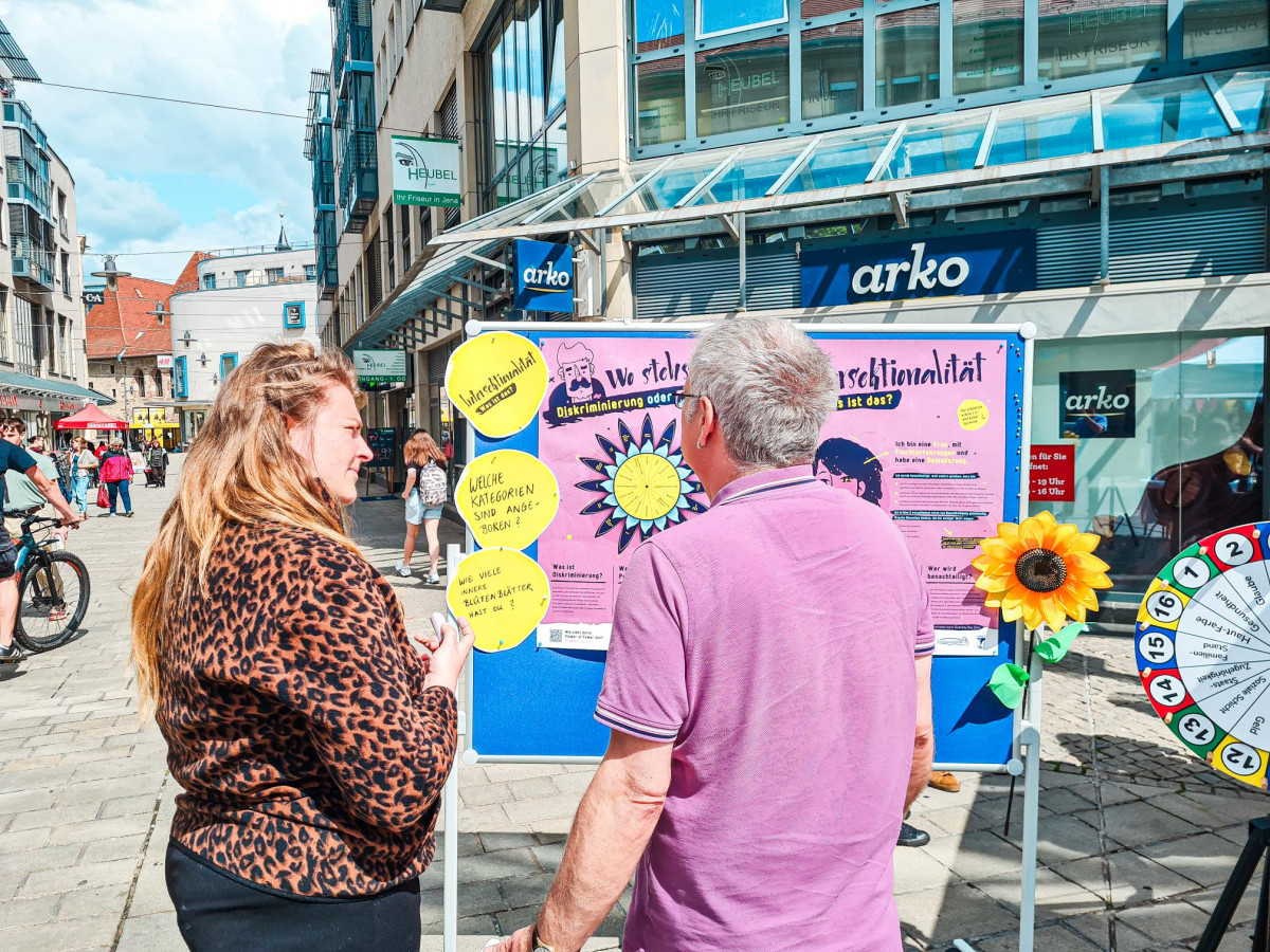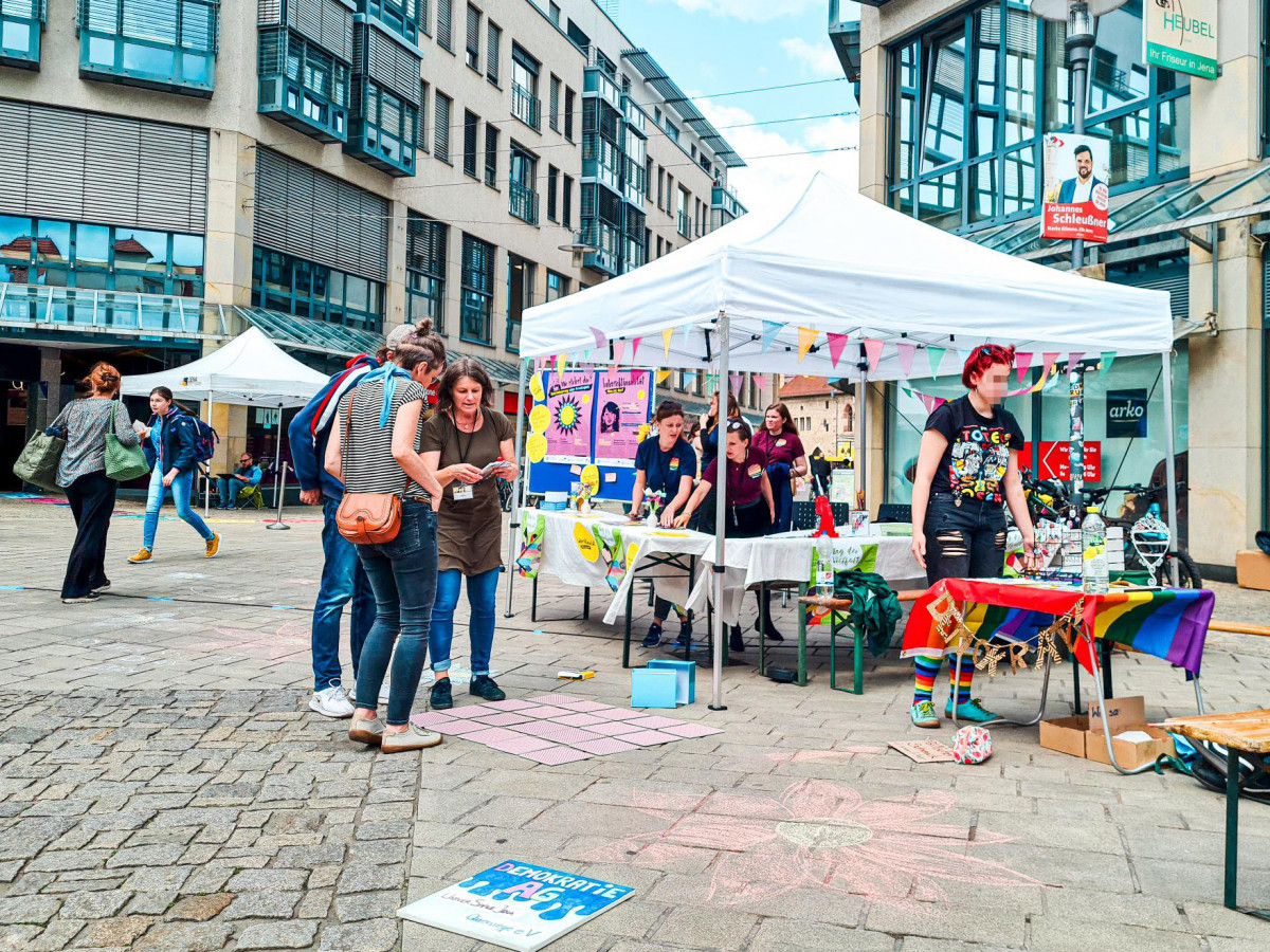 Am 28.5. fand in Jena der Tag der Vielfalt statt! Gemeinsam mit der Kindersprachbrücke, Jumäx und der SBW Lebenshilfe haben wir über Intersektionalität aufgeklärt und persönliche Privilegien mit der »Flower of Power« gecheckt. Es ist so wichtig, unsere unterschiedlichen Lebensrealitäten zu verstehen und Ungerechtigkeiten durch Reflexion und entsprechendes Handeln zu bekämpfen – und darüber aufzuklären. Dafür ist der Jenaer Tag der Vielfalt, organisiert von unserer Lichtstadt, perfekt geeignet. Die inhaltliche Zusammenarbeit der vier Träger zu diesem Thema und der gemeinsame Stand vor dem Stadtlab haben uns viel Spaß gemacht.