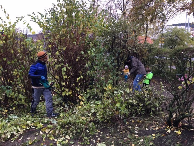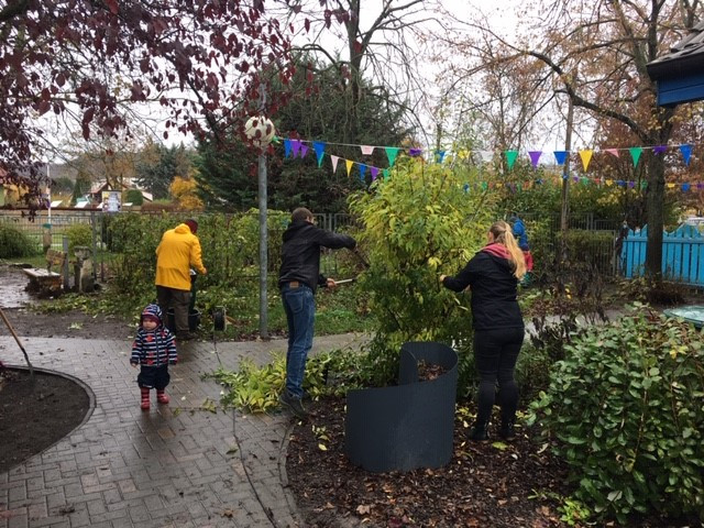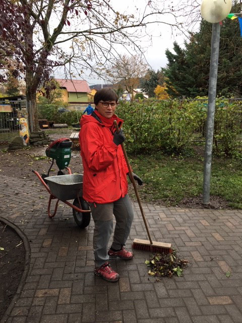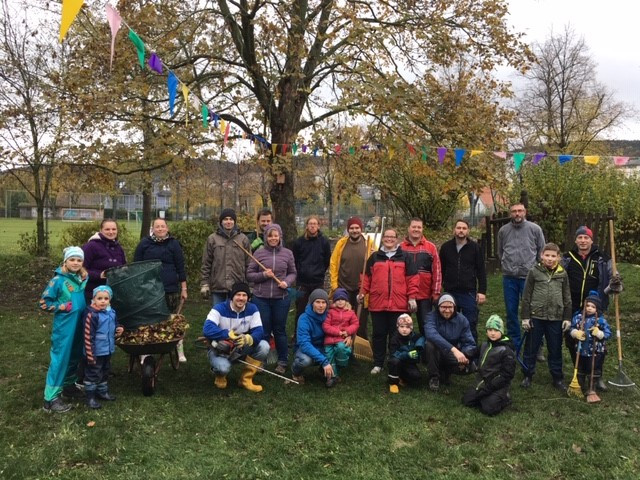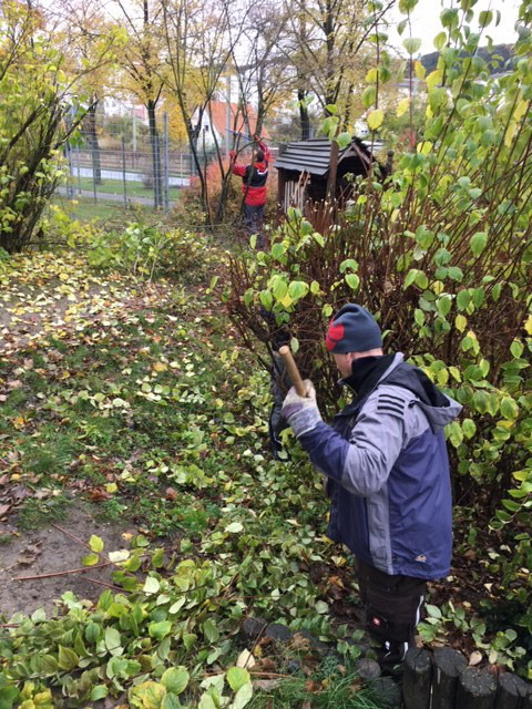 Am 9. November 2019 krempelten rund 20 Eltern, Pädagog*innen und 10 Kinder die Ärmel hoch und machten sich mit Besen, Schubkarren, Heckenscheren und Hexlern daran, den Garten des Schwabenhauses winterfest zu machen. Bei dem dreistündigen Arbeitseinsatz wurden mit viel Muskelkraft rund 6 Kubikmeter Laub und Grünschnitt aus dem Garten entfernt. Zur Stärkung gab es ein gemeinsames Mittagessen: Leckerer Gulasch und eine vegetarische Suppe von Koch Andi.