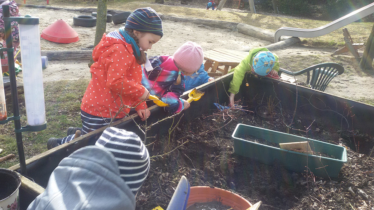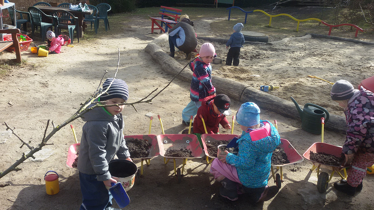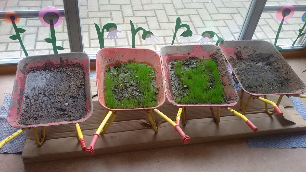 Da Ostern vor der Tür stand, wollten wir ein wenig Gras und Sonnenblumen aussäen und Ben hat ein kleines Projekt daraus gemacht, um den Kindern zu zeigen, welche Bedingungen Pflanzen brauchen, um zu wachsen. Dazu wurden einige kleine Schubkarren mit Erde beladen und auf der Erde wurden die Samen ausgesät. Danach wurden die Schubkarren an 3 verschiedene Orte gestellt: ein Paar ins Restaurant, eine in den Garten und weitere in den Vorraum, so dass sie unterschiedlichen Temperaturen ausgesetzt waren. Die Kinder konnten so die Auswirkungen der unterschiedlichen Bedinungen sehen und fühlen und nachdem die zwei Schubkarren im Restaurant die besten Ergebnisse zeigten, wurden schließlich alle dort aufgestellt und das Gras konnte weiterwachsen. Nur in der Schubkarre aus dem Garten wuchs leider nichts. Nach einiger Zeit war das Gras schon sehr hoch gewachsen und die Kinder setzten die gezogenen Pflanzen im Garten ein.