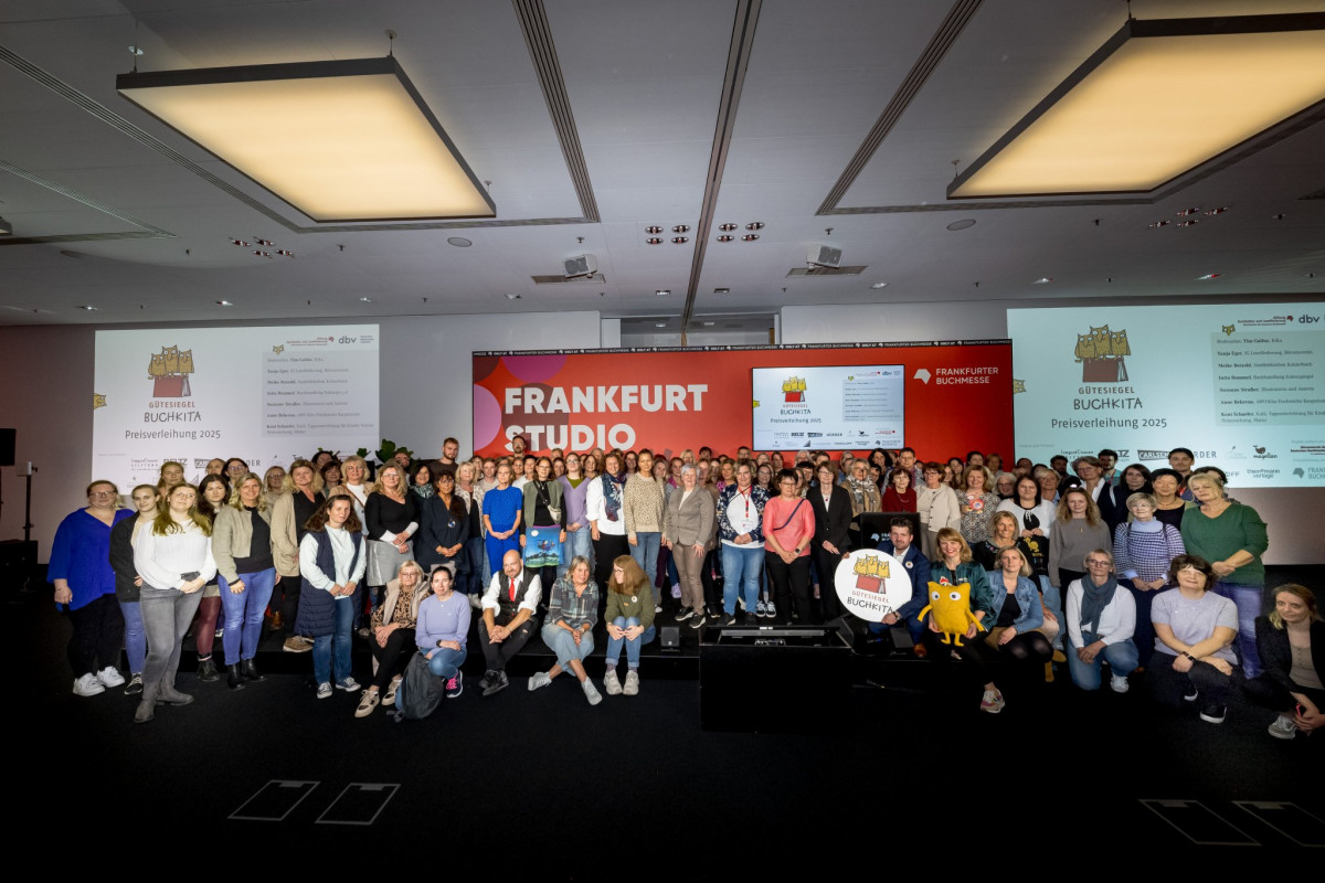 All das qualifiziert den Pi mal Daumen als Buch-Kita! Das Siegel nahmen Yannick Weiser und Astrid Jahns stellvertretend für das Team am 17.10. in Frankfurt entgegen. »Die Preisverleihung war sehr wertschätzend, der Moderator und die Jurymitglieder auf der Bühne haben uns wirklich ein gutes Gefühl vermittelt! Es wurde gelobt, dass wir es neben unserer »eigentlichen« Arbeit noch geschafft haben, die hohen Kriterien für die Bewerbung zu erfüllen. Das hat uns sehr stolz gemacht.« Fasst Yannick die Preisverleihung zusammen. Dort gab es eine Verlagsführung für alle Kita-Vertreter*innen und ein tolles Buchpaket.