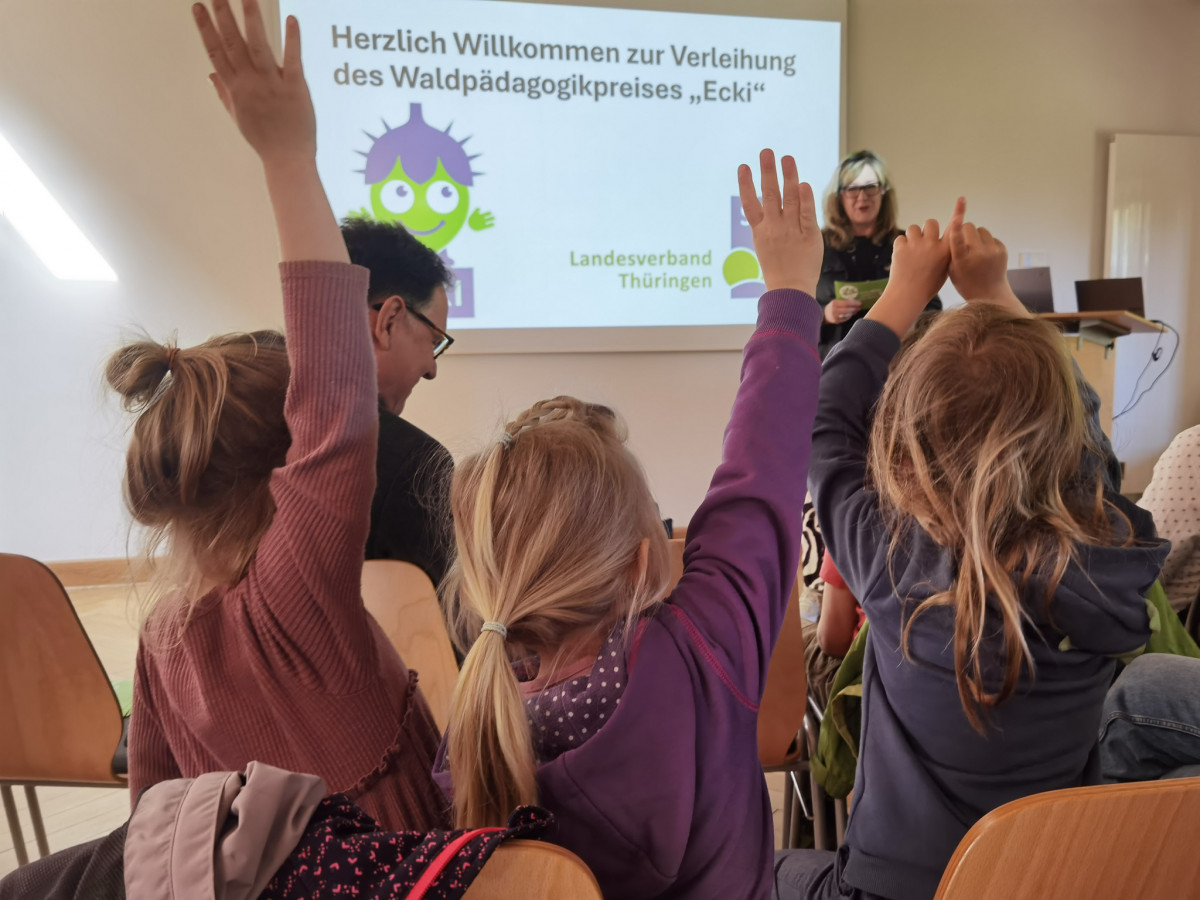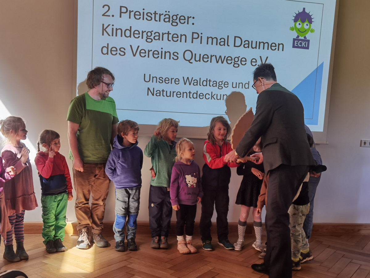 Am 13.5. wurde im Naturerlebniszentrum forum natura auf dem Jenaer Schottplatz der Waldpädagogikpreis »Ecki« verliehen. Aller zwei Jahre zeichnet der Landesverband Thüringen der Schutzgemeinschaft Deutscher Wald herausragende waldpädagogische Initiativen und Projekte aus. Mit dabei an diesem Vormittag: 13 aufgeregte und stolze Kinder aus unserer Kita, um für das zweitplatziertes Projekt »Unsere Waldtage und Naturentdeckungen« den wunderschönen Preis entgegenzunehmen und sich riesig über 500€ Preisgeld zu freuen.