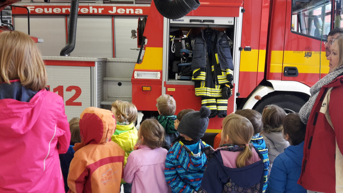Wir haben am Dienstag, den 26.04.2016, das Gefahrenabwehrzentrum in Jena besucht. Wir wurden von Frau Sonnenkalb begrüßt und haben von ihr viele interessante Dinge rund um die Feuerwehr erfahren und angesehen. Gestartet sind wir bei den Rutschstangen, die die Männer und Frauen der Berufsfeuerwehr benutzen, um schnell zu ihren Fahrzeugen zu kommen, mit denen es zum Einsatz geht. Eine Stange geht sogar über 3 Etagen. Anschließend haben wir uns die Kleidung angesehen und gemeinsam mit Frau Sonnenkalb gesprochen, wofür diese wichtig und nötig ist. Dann ging es in die Halle zu den verschiedenen Feuerwehrfahrzeugen. Besonders das Fahrzeug mit der großen Drehleiter auf dem Dach hat uns sehr gefallen. Wir durften uns sogar in ein Feuerwehrfahrzeug setzen. Das Highlight unseres Besuches war dann eine Durchsage mit Signal, die extra für uns Kinder des BiLLY gemacht wurde: „Proberuf. Einsatz für die Kinder der Kita BiLLY!“ Damit endete der Vormittag im Gefahrenabwehrzentrum, bei dem wir Neues über die Feuerwehr erfahren haben.