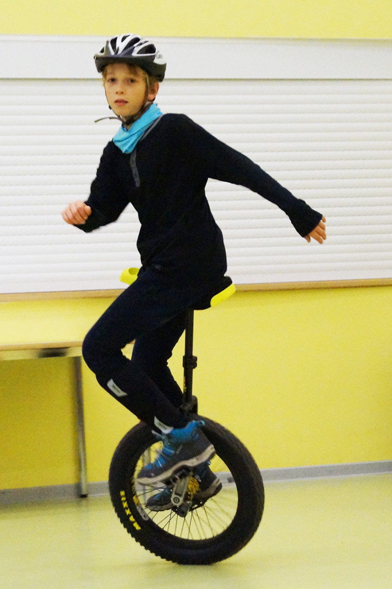 Neben den Zirkus-Projektwochen, die regelmäßig für den 6. Jahrgang stattfinden, ist auch die Zirkus-AG der UniverSaale schon zur guten Tradition an unserer Schule geworden. In diesem Jahr wird sie als offene AG auch für Schüler_innen der Grundschule SteinMalEins angeboten. Von den 27 Kinder, die an der AG teilnehmen, kommen einige jeden Donnerstag dank einer Fahrgemeinschaft vom Schulstandort Lobeda. Fünf Erwachsene und fünf Schüler_innen trainieren die AG in den Bereichen Jonglage, Einrad fahren und Akrobatik.