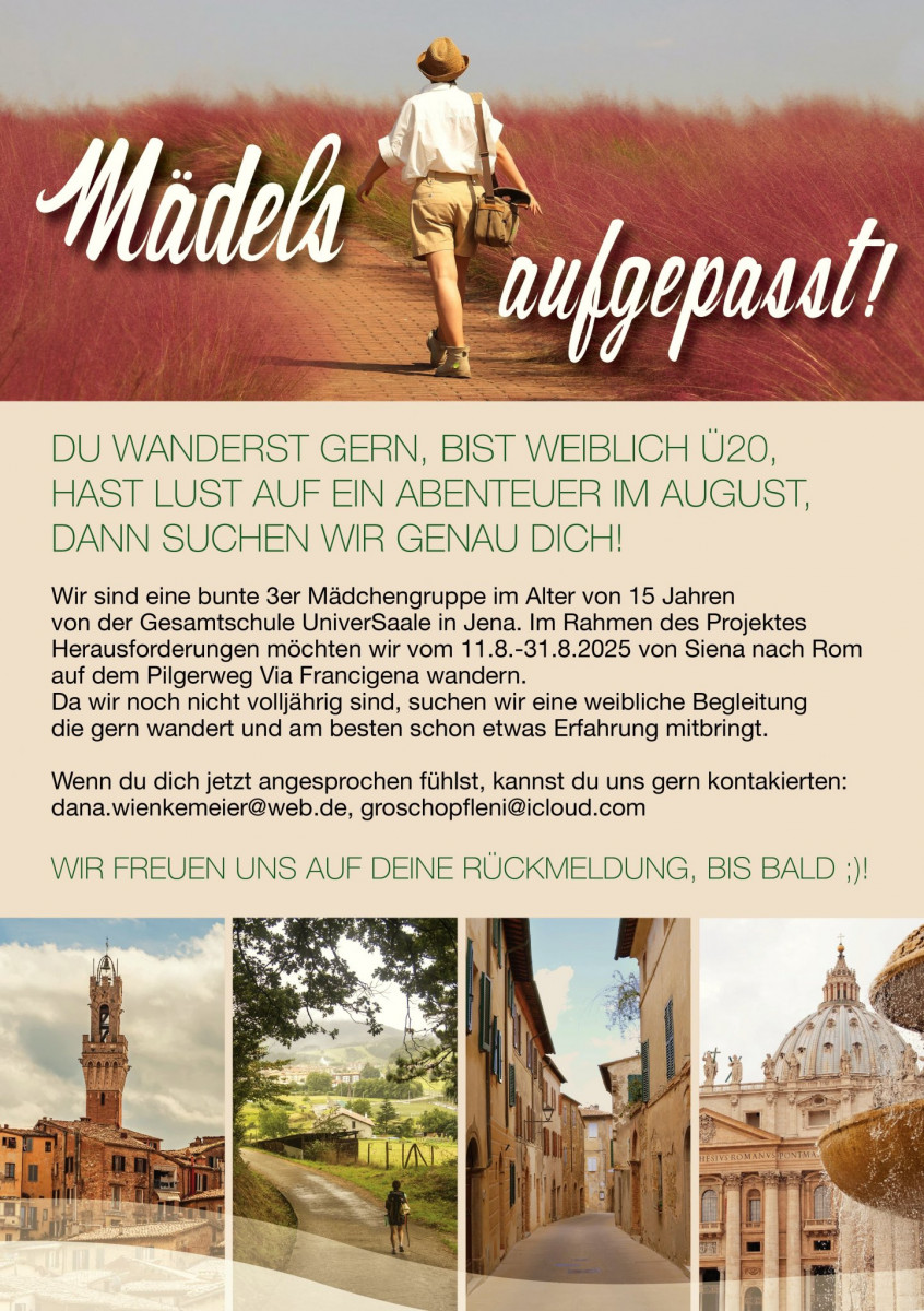 Die Schüler*innen sind im 9./10. Jahrgang und möchten sich ganz unterschiedlichen Herausforderungen im Zeitraum vom 11.08.2025 – 29.08.2025 (ungefähre Angabe, kann auch innerhalb der Sommerferien liegen) stellen. Zu zweit oder in Kleingruppen planen und führen sie ihre Herausforderung weitestgehend selbstständig durch. Bei Projekten, die nicht an einem festen Ort stattfinden, benötigen sie eine erwachsene Begleitung. Diese wird von uns eingewiesen und unterstützt. Die Kosten (außer für Essen) werden von der Schüler*innengruppe übernommen. Der Erhalt eines Scheines für das Orientierungspraktikum für Student*innen an der EAH Jena ist möglich. Studierende der FSU können einen Praktikumsnachweis erhalten.