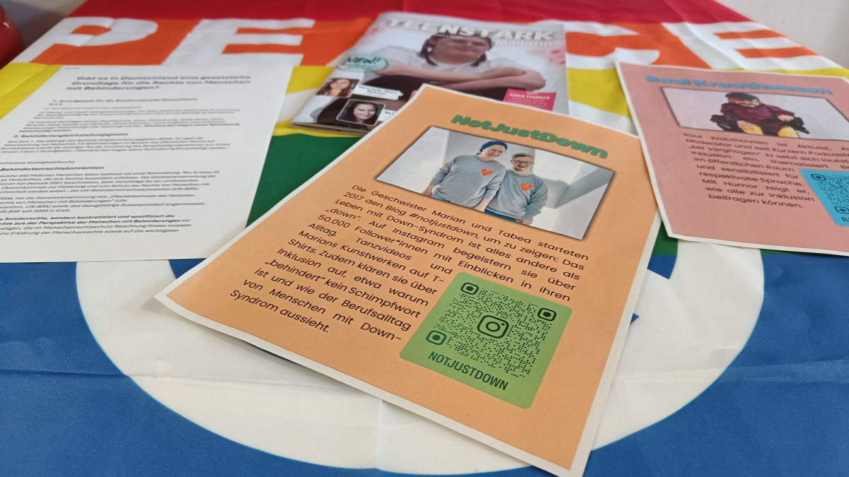 Dazu hatten sich die Schüler*innen einen Parcours durchs Schulhaus mit verschiedenen Stationen überlegt, der in 3er Teams zu bewältigen war. Die Schwierigkeit dabei: ein Teammitglied sieht nichts, ein Teammitglied hört nichts und das dritte Teammitglied darf nicht sprechen. Zudem gab es Steckbriefe zu verschiedenen wichtigen »Inkluencer*innen« (= Menschen, die sich auf Sozialen Medien wie Instagram für die Rechte von Menschen mit Behinderung einsetzen und aufklären) sowie Infomaterial.