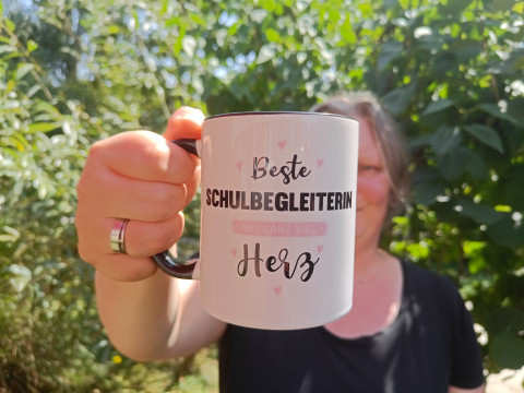 Schulbegleiterin und Teamleiterin Bianca strahlte mit der Sonne um die Wette, als sie letzte Woche mit ihrer neuen Tasse im Büro erschien – ein Geschenk, das sie zum Abschluss ihrer gemeinsamen Zeit von einem Schüler und seinen Eltern bekommen hatte. Sie kennt den mittlerweile 15–Jährigen seit der 2. Klasse. 6 Jahre lang war sie seine Schulbegleiterin. In dieser Zeit haben sie viel miteinander erlebt und es hat sich eine großes Vertrauen zwischen den beiden entwickelt. Nach der Beendigung der Schule geht der Jugendliche nun seine eigenen Wege und gab Bianca noch eine wunderbare Wertschätzung mit auf den Weg.