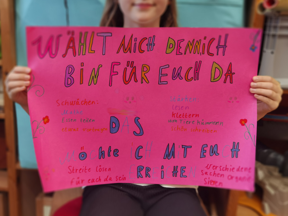 Gleich zu Schuljahresbeginn findet eingebettet in unsere WUBAMI-Wochen ( = Wunderbares Miteinander) – die dem Ankommen, Kennenlernen und Zusammenwachsen der jahrgangsgemischten Stammgruppen dienen – die Wahl der Schülersprecher*innen statt. Die Kinder des 3. und 4. Jahrgangs nehmen als Kandidat*innen teil und werben mit einem selbstgestalteten Plakat in ihrer jeweiligen Stammgruppe um Stimmen. Dieser Prozess wird pädagogisch belgeitet, z.B. werden Bücher wie »Wählt mich« besprochen und gemeinsam die Aufgaben, welche die Schülersprecher*innen erfüllen sollen, festgelegt. Der Wahl an sich geht ein Podium voraus: Die Kandidat*innen stellen sich vor und beantworten Fragen ihrer Mitschüler\innen. Bei der Wahl werden in der Regel 2 Kinder pro Stammgruppe gewählt. An jedem unser beiden Grundschul-Standorte gibt es somit (mindestens) 8 Schülersprecher*innen. Stolz, Freude aber auch Enttäuschung über eine Nicht-Wahl wie auch Angst vor der neuen Aufgabe sind Gefühle, mit denen die Kinder dann möglicherweise umzugehen lernen müssen.