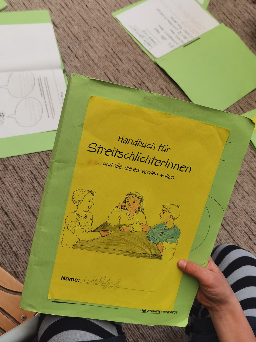 Ein zweiter wichtiger Teil ihrer Arbeit ist ihre Rolle als Streitschlichter*innen. Die Kinder durchlaufen dafür ein Extra-Programm, wie eine Ausbildung. Im Zentrum stehen dabei die Fragen: Wie schlichtet man Streit? Wie findet man gemeinsame Lösungen für ein Konflikt? Sie lernen in Rollenspielen Regeln kennen (Wie funktioniert aktives Zuhören? Warum sind Beleidigungen tabu?) und Fragen, wie man der Ursache eines Streits auf den Grund geht. Ein Konflikt, der im letzten Schuljahr bearbeitet wurde, war der Sportunterricht: Dort kam es vor, dass einige Kinder immer besonders laut waren und andere beim Unterricht gestört haben. Gemeinsam wurde einen Vorschlag erarbeitet, wie man die Gruppe besser einteilen könnte und dieser Vorschlag wurde per Brief der Schulleitung unterbreitet. So wurde es dann auch umgesetzt.