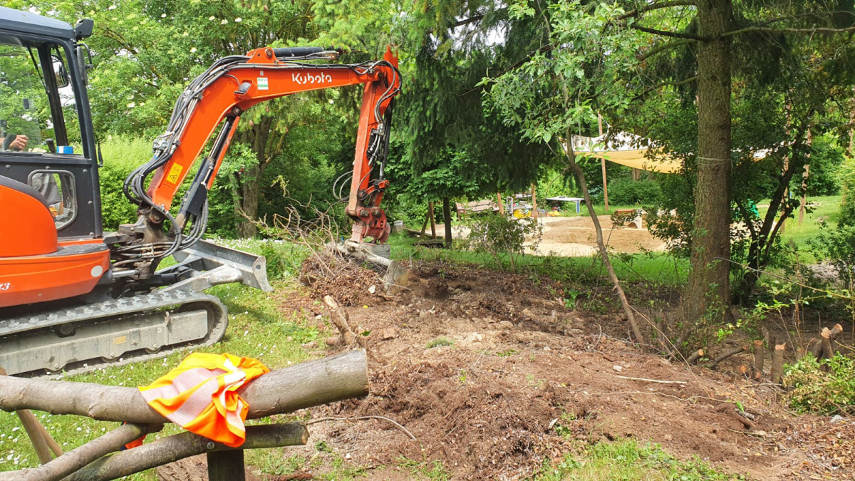 Unsere Kinder erlebten den Prozess hautnah mit. Ein Highlight dabei waren die Aushubarbeiten durch einen externen Bagger im Juni, der uns bei der Beseitigung der tiefen Wurzeln half. Unser tolles Hausmeisterteam hat die ganze restliche schwere Arbeit übernommen u.a. die Beseitigung der alten Hecke, die Vorbereitung der Böden, den Abtransport des Grünschnitts, das Einsetzen der Gehölze. Und unsere Kinder haben uns beim wochenlangen Gießen bis in den September hinein ganz toll unterstützt.