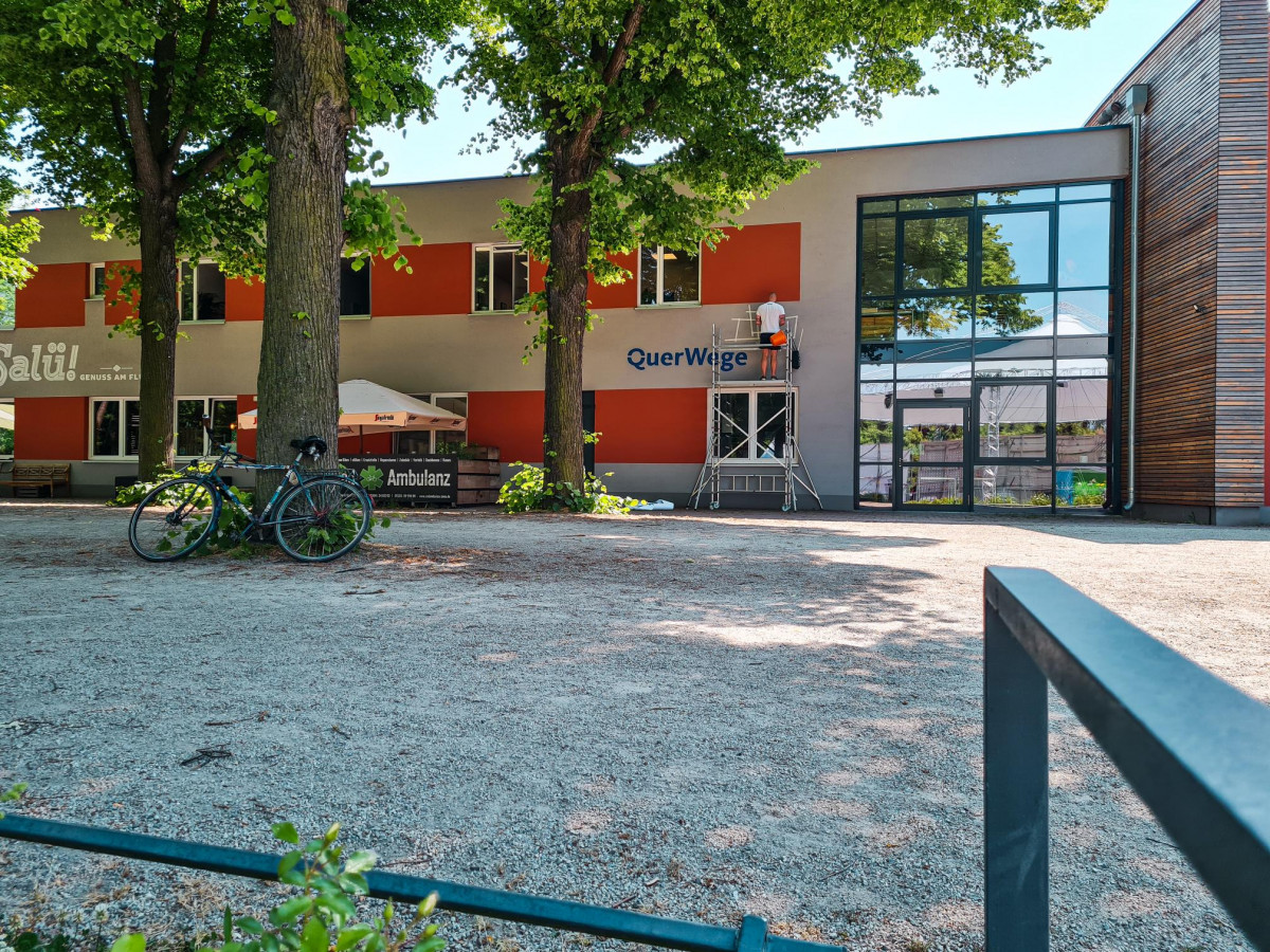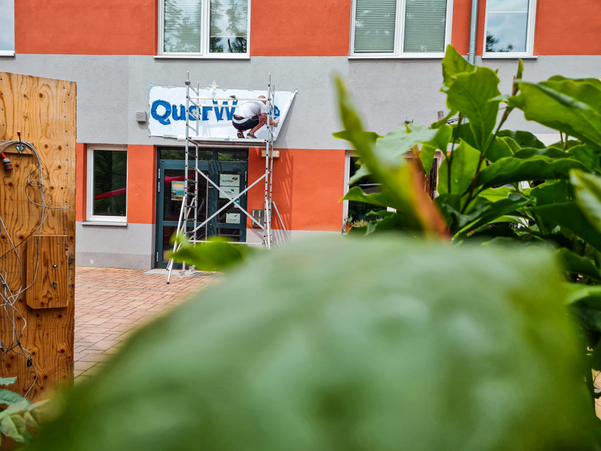 Habt ihr es schon gesehen? Unsere Geschäftsstelle am Burgauer Weg, die wir Ende 2022 bezogen haben, ist jetzt auch von außen als QuerWege-Hauptquartier sichtbar. Am 8. Juni wurde die Fassade mit Schablone und Farbe bearbeitet und unser Logo strahlt jetzt im Paradies :)
