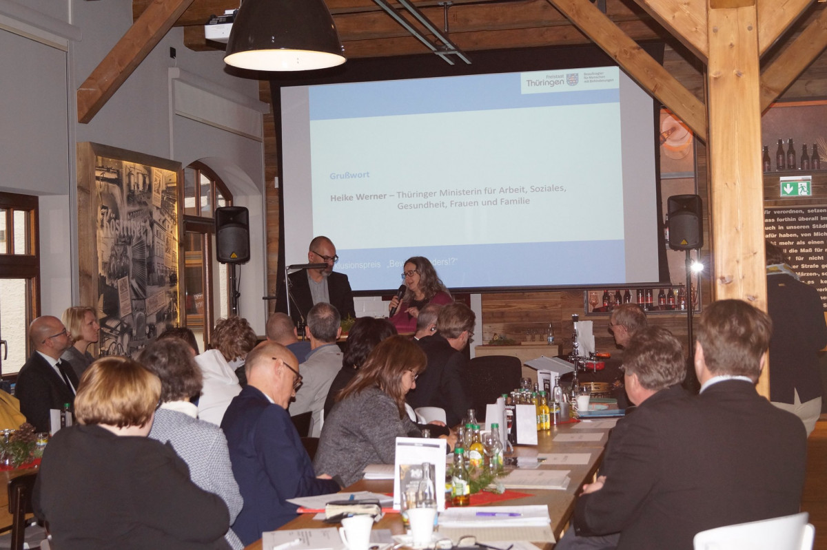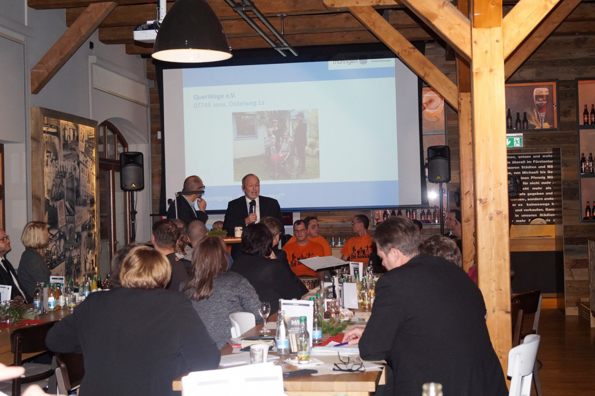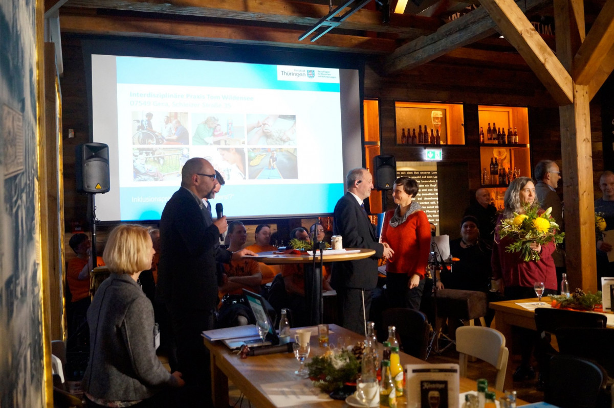 Bad Köstritz, den 04.12.2017. Der Behindertenbeauftragte der Thüringer Landesregierung, Joachim Leibinger, hat gemeinsam mit Arbeitsministerin Heike Werner und dem Chef der Bundesagentur für Arbeit Regionaldirektion Thüringen, Kay Senius, die Preisträger des Inklusionspreises „Bewusst anders?!“ ausgezeichnet. Bewertet wurden von der Jury aus dem Thüringer Arbeitsministerium gemeinsam mit der Handwerkskammer für Ostthüringen und der IHK Ostthüringen zu Gera, ob die vorgeschlagenen Unternehmen spezielle Arbeitsbereiche für behinderte Mitarbeiter schaffen, ob Azubis mit Behinderung übernommen werden oder ältere behinderte Mitarbeiter im Unternehmen gehalten werden. QuerWege war nominiert. Der mit 3.000 Euro dotierte Preis ging zu gleichen Teilen an die Porzellanfabrik Hermsdorf GmbH und die Interdisziplinäre Praxis Tom Wildensee. Beide Unternehmen sind mittelständisch geprägt und übererfüllen ihre Beschäftigungsquote (Anteil von schwerbehinderten Menschen ca. zehn Prozent).