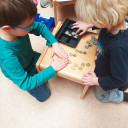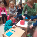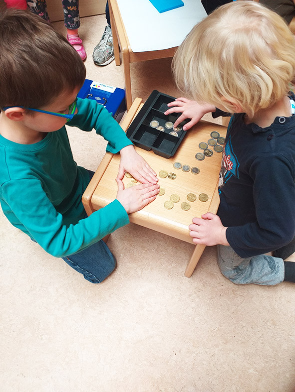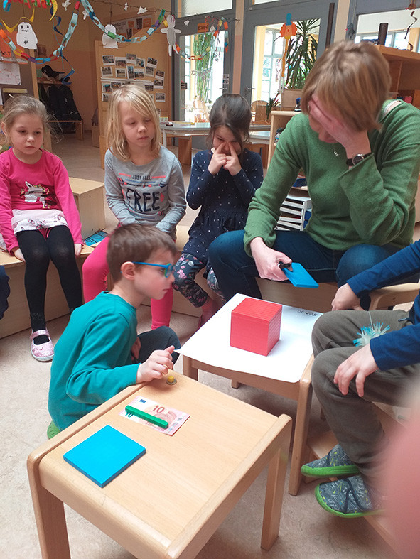 Als wir nach erfolgreicher Arbeit zurück im Kindergarten angekommen waren, haben wir zusammen mithilfe von verschiedenen Formen abgeschätzt, wieviel wir vom neuen Baumhaus nun zusammen haben. Ein kleiner gelber Block bedeutete 1€, ein gründer langer 10€, blauer Quader 100€ und rote Quader unglaubliche 1000€. Wie erfolgreich der Kuchenbasar war, haben die Kinder dann daran gemerkt, dass 580€ über die Hälfte eines roten Blocks sind und wir etwa 4 rote Blöcke brauchen, um ein neues Baumhaus zu bekommen.