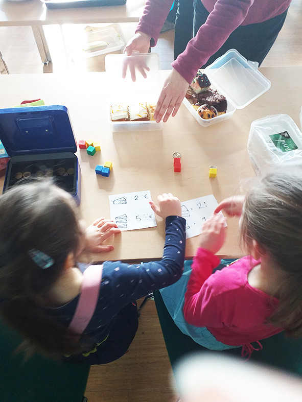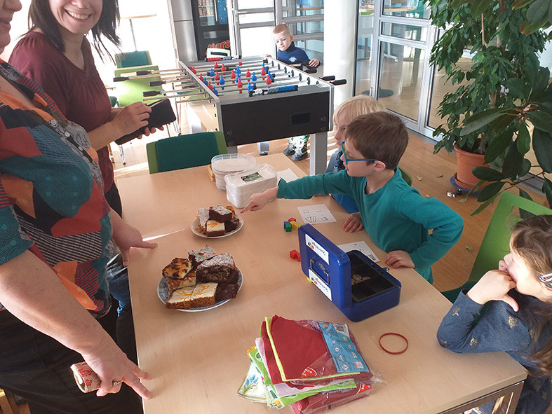 Glücklicherweise hatte uns das MPI zu diesem Zweck die Chance geboten, einen Kuchenbasar zu veranstalten. Fleißige Eltern unterstützen uns dabei mit selbst gebackenem Kuchen. In der Kantine des MPI bauten die Kinder am Vormittag dann einen Stand auf und schnitten die Kuchen in verschiedene geometrische Formen und erklärten den Kund*innen, welche Anzahl an Köstlichkeiten zu welchen Preisen erworben werden konnten: Ein großes Stück für 2€, ein kleines für 1€ . Hatte sich ein*e kuchenhungrige*r Mitarbeiter*in des MPI dann den selbst mitgerachten Teller mit Kuchenstückchen gefüllt, wurden mit dem Verkaufsteam über Rabatte verhandelt. Die Kinder lernen dabei am praktischen Beispiel gleich etwas über Mengen und Summen wie 6 und 7, für die man mehr als eine Hand zum abzählen braucht :) Die Kinder berieten aber nicht nur die Kunden wunderbar über ihre Produkte, zählten gemeinsam das Geld, sondern genossen auch ihre Pause am Kicker-Tisch des MPI, genau wie die Wissenschaftler*innen in ihren Pausen.