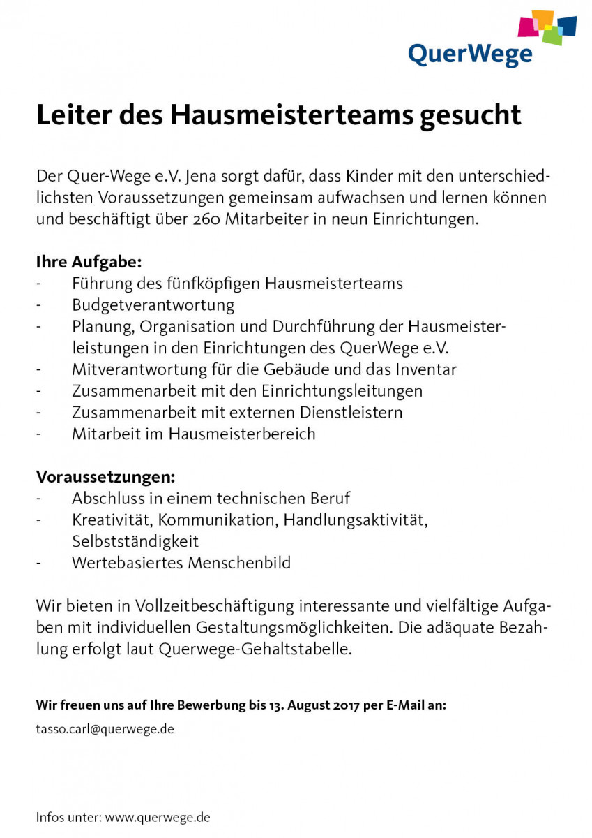 - Planung, Organisation und Durchführung der Hausmeisterleistungen in den Einrichtungen des QuerWege e.V.