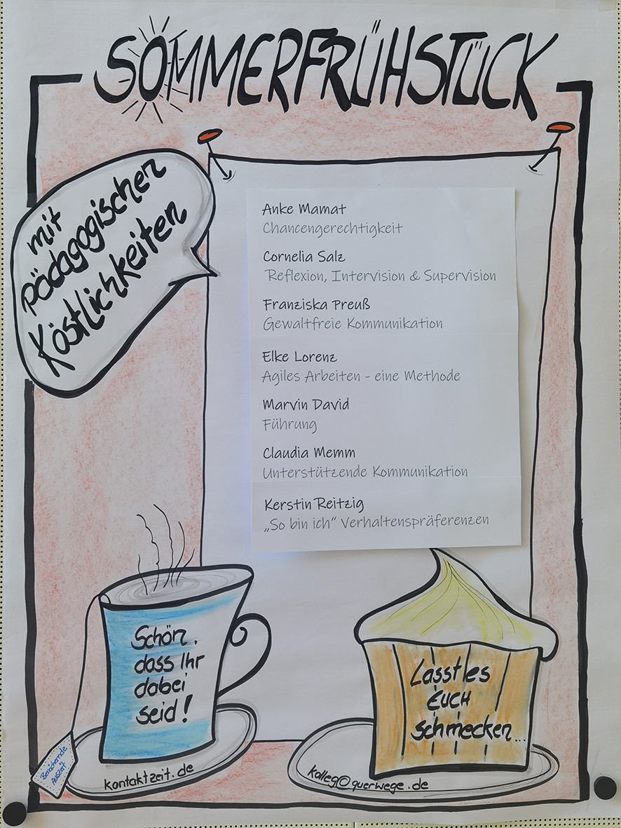 Am 11. August luden das Kolleg von QuerWege und Kerstin Reitzig (Kontaktzeit) zum zweiten Mal zu einem »Sommerfrühstück« ein, bei dem neben leckerem Essen vor allem pädagogische Köstlichkeiten serviert wurden. In der Aula der Schulen im Paradies, und dem Baumsaal davor, trafen sich rund 30 Teilnehmer*innen – bunt gemischt in ihren beruflichen Professionen – zu einem gemeinsamen Tag mit fachlichen Impulsen und anregenden Gesprächen. Insgesamt sieben Impulsgeber*innen stellten ihr jeweiliges Thema vor und luden zum Austausch ein.