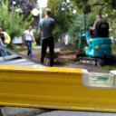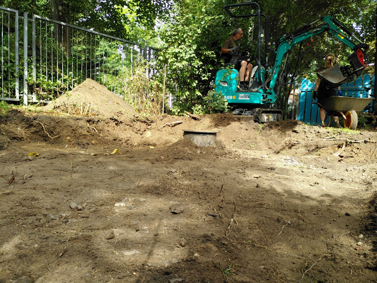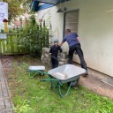 Unsere Hausmeister Frank und Marco werden in den kommenden Tagen das Loch verfüllen, Pflastern und anschließend die neue Gartenhütte aufbauen.