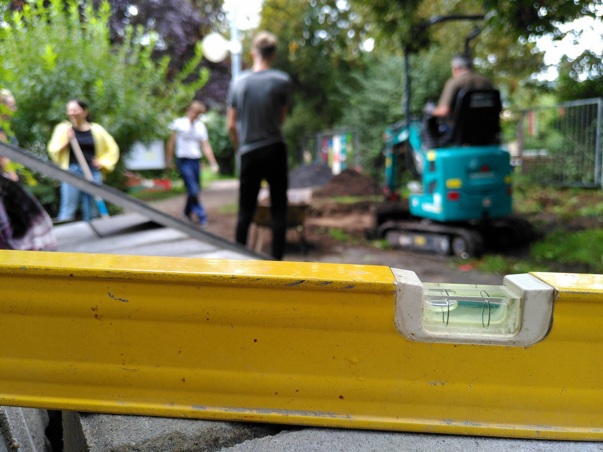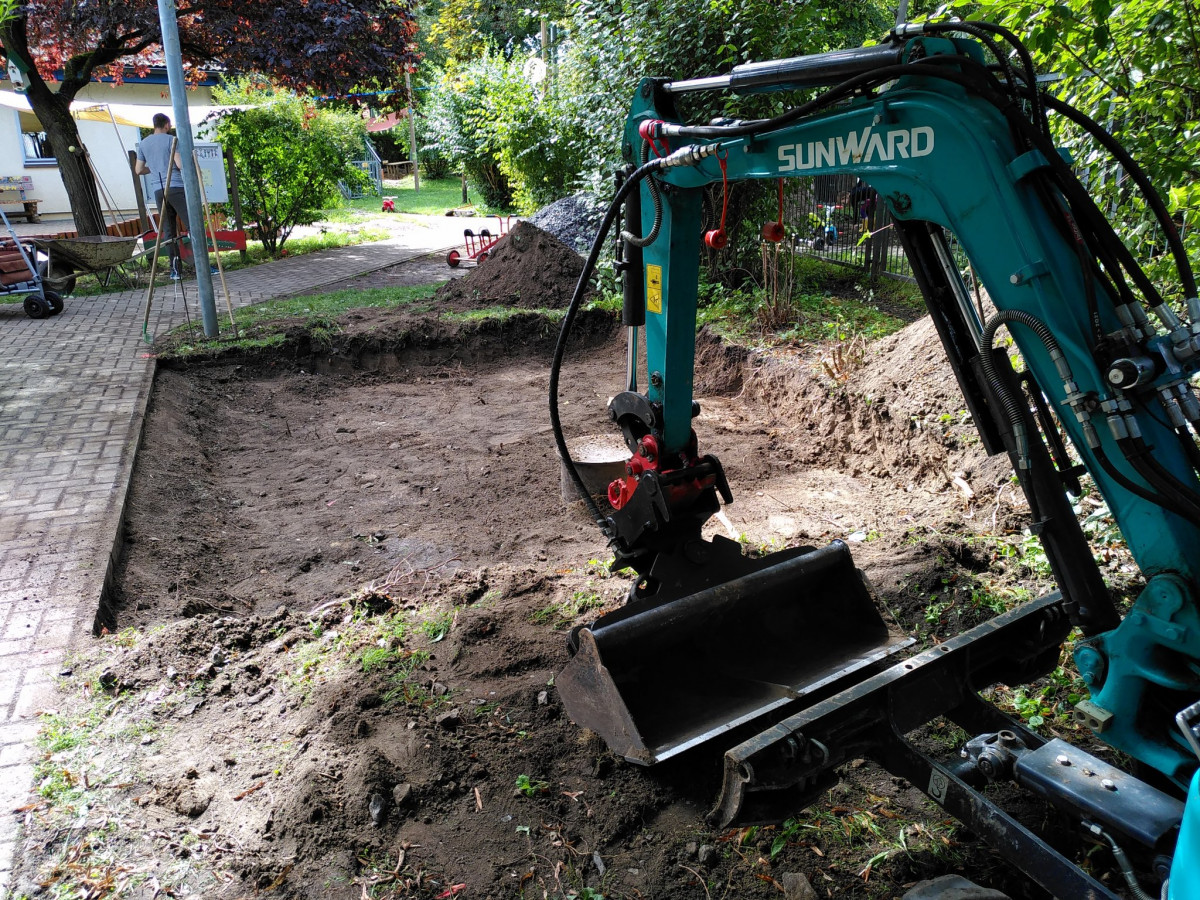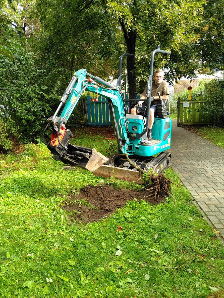 Familie Niepel als Elternsprecherinnen hatten den Baggerfahrer organisiert, der ein 10 m² Loch für unsere Gartenhütte aushob. Zahlreiche fleißige Eltern und Kinder verteilten Schubkarre um Schubkarre Erde in unseren Garten.