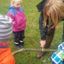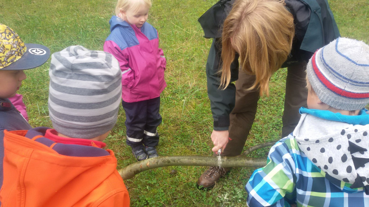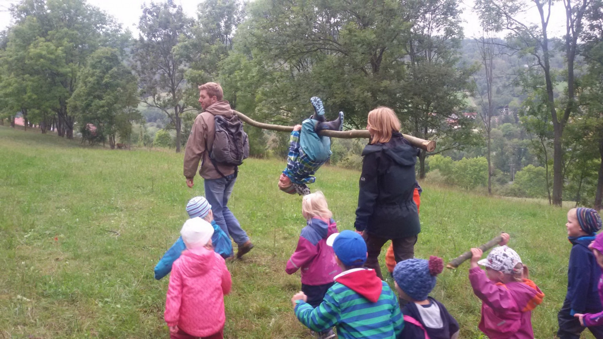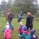 Our excursion to the forest was very exciting this week. We came upon some trees that had been felled, we had a knife and a saw. The saw was used to cut lengths of wood to use for various games. But first everybody ate their snacks to have plenty of energy for the activities. First was a relay race using cut branches as markers. The children were in two teams and each child tagged the next child when the lap was complete. Afterwards the children used TPR to practice verbs in English, which involved a lot of running jumping and driving. The last activity was to carry the children over the field. The children hung on with all their strength and some of the preschool children tried carrying the younger children. When it was time to go home the children collected the wood together and carried it in pairs back to the kindergarten.
