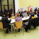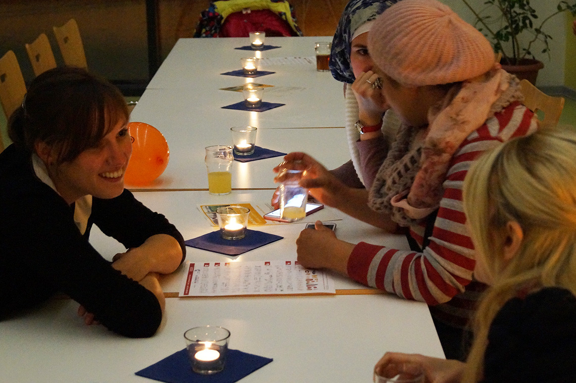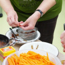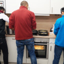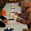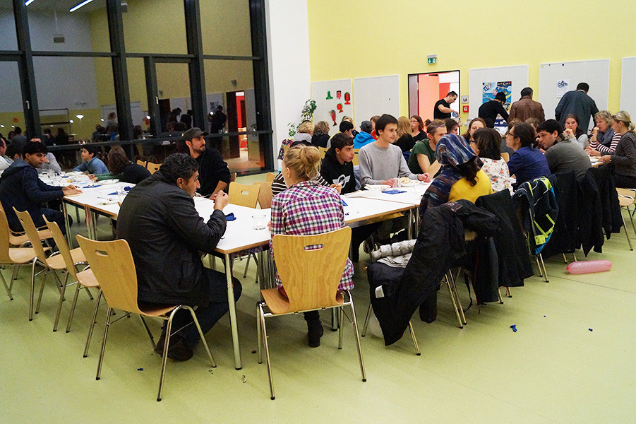 Am Freitag, dem 20.11. haben wir zum zweiten Mal bunte Töpfe gefüllt und geleert. Rund 50 Menschen verschiedener Herkunft, die Hälfte von ihnen Geflüchtete, die andere Hälfte Jenaer_innen, fanden sich in unserer Aula und Schulküche im Paradies ein. Kurzfristig hatte sich nochmal das Kochthema des Abends geändert und so haben wir unter der Anleitung von Nuria ein afghanisches Gemüsegericht – Kabuli und Bedenjan – zubereitet. Viele helfende Hände, die schälten, schnippelten, rührten und brieten, waren beteiligt, um aus unzähligen Auberginen, Tomaten, Zwiebeln, Karotten, Mandeln, Rosinen und 10kg Reis ein köstliches Essen zu kochen. Für die Kinder stand Plätzchenteig bereit, der gerollt und ausgestochen werden durfte. Wir haben sowohl liebe Gäste vom letzten Kochabend wiedergesehen als auch viele neue Menschen kennengelernt. Und so hat sich wieder bestätigt: Essen hält nicht nur Leib und Seele zusammen, sondern bringt auch Menschen einander näher! Danke an alle, die mitgemacht haben! Vor allem an Nuria, die in der kleinen Schulküche die Regie über das Rezept übernommen hat, sowie an Grace und Lucila, die umtriebigen Organisatorinnen hinter den Bunten Töpfen!