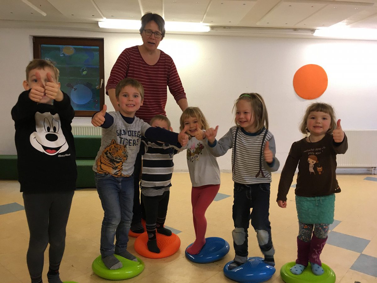 Die Kinder freuten sich riesig über die vielen bunten Wackelkissen. Sie probierten sich aus und stellten fest, dass es gar nicht so einfach ist darauf zu stehen und zu sitzen. Mit dem Balancekissen kann unter anderem der Gleichgewichtssinn und die Koordination verbessert werden – für ein gutes Körperbewusstsein. In Bewegung durchblutet unser Gehirn besser und der Informationsfluss steigt an, so gelangt mehr Sauerstoff ins Gehirn. Gleichzeitig wird Stress abgebaut:)
