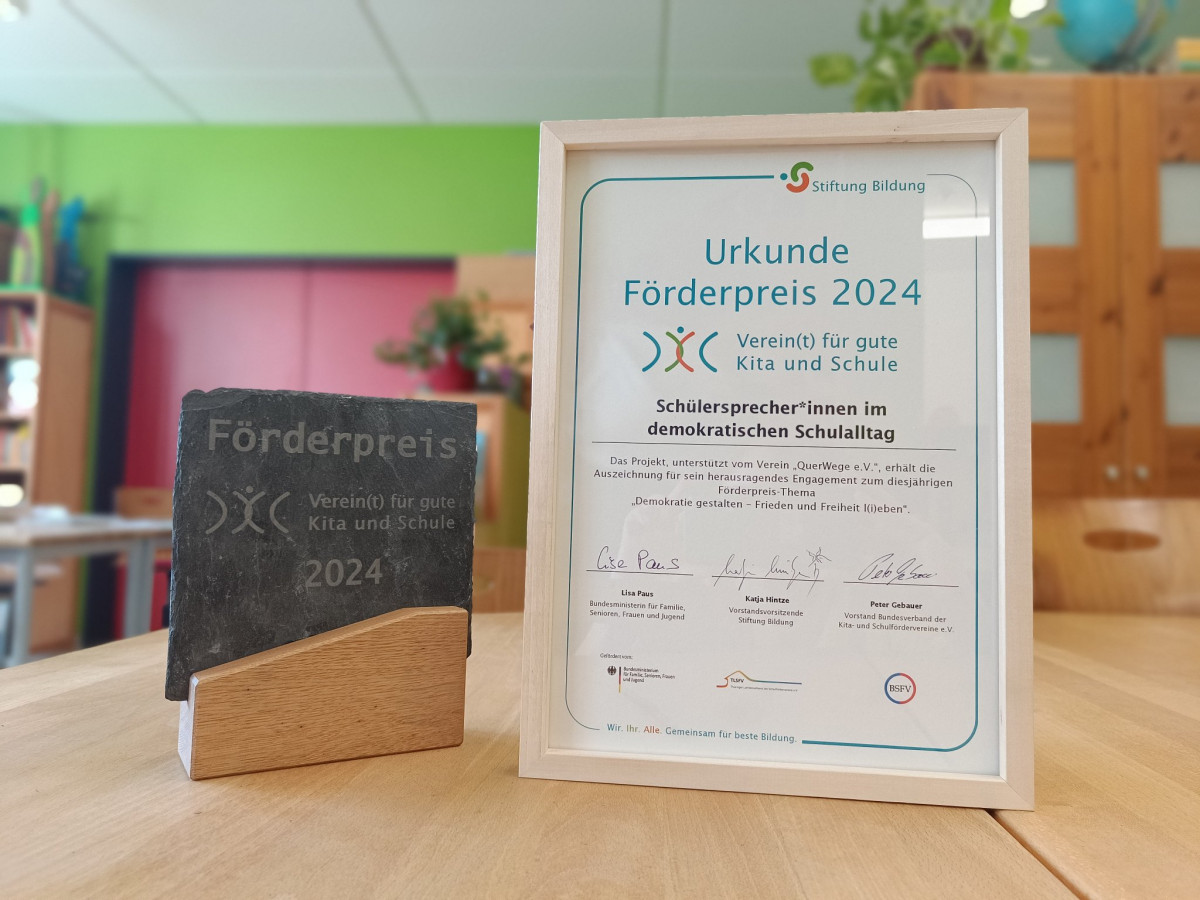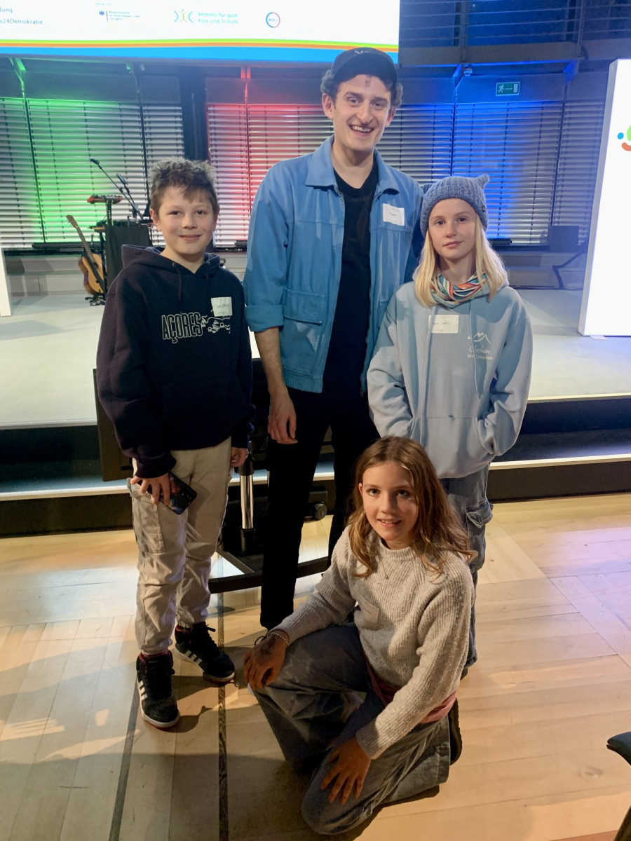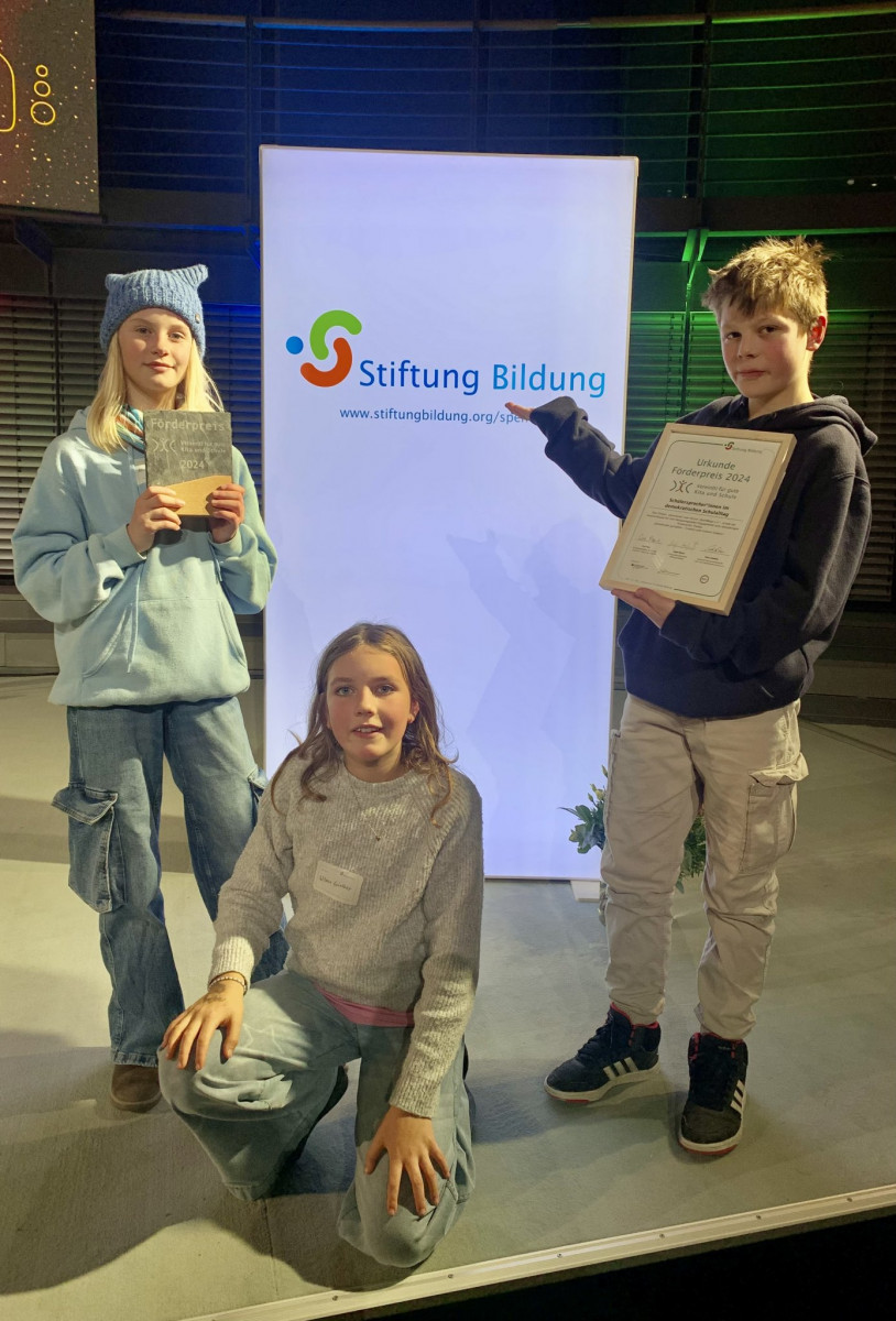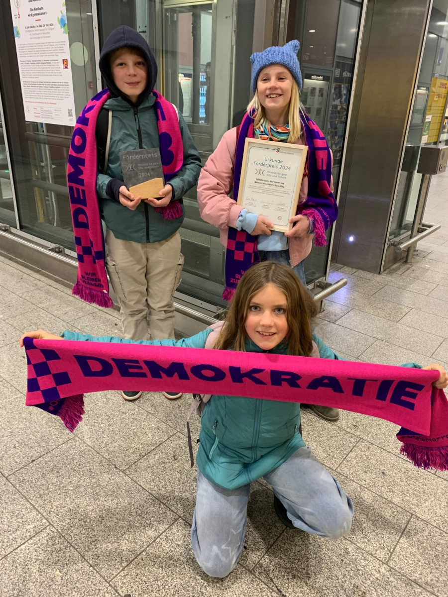 Leon, Wilma und Anna durften am Freitag mit SteinMalEins-Pädagogin Anke Appenroth nach Berlin fahren – zur Verleihung des Förderpreises »Verein(t) für gute Kita und Schule« der Stiftung Bildung. Sie waren eingeladen, weil die Grundschule mit dem Projekt »Schülersprecher*innen für einen demokratischen Schulalltag« nominiert war auch am Voting für den Publikumspreis teilgenommen hat. Unser Projekt hatte die Chance, zum diesjährigen Wettbewerbsthema »Demokratie gestalten – Frieden und Freiheit l(i)eben« einen Preis aus Berlin mitzunehmen.