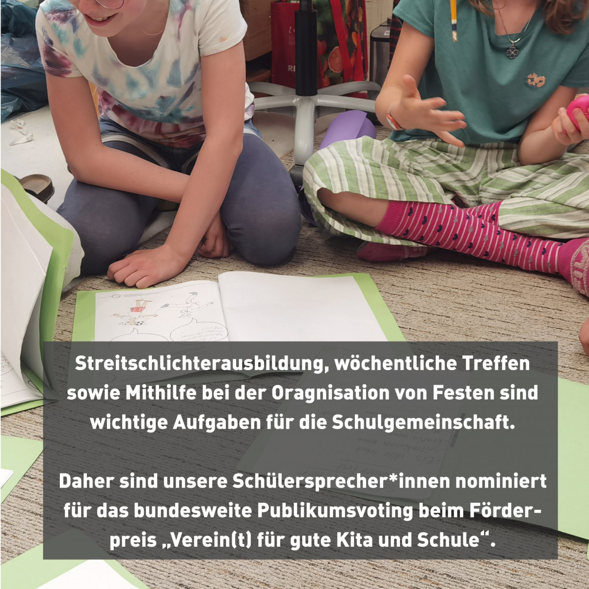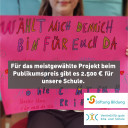 Unser Projekt »Schülersprecher{*innen im demokratischen Schulalltag« ist als ausgezeichnetes Projekt beim bundesweiten Onlinevoting mit dabei. Die drei Projekte mit den meisten Stimmen gewinnen ein Preigeld bis zu 2.500€. Was unsere Schülerspreche*innen in unserer Schule alles bewegen, lest ihr hier auf unserer Homepage: