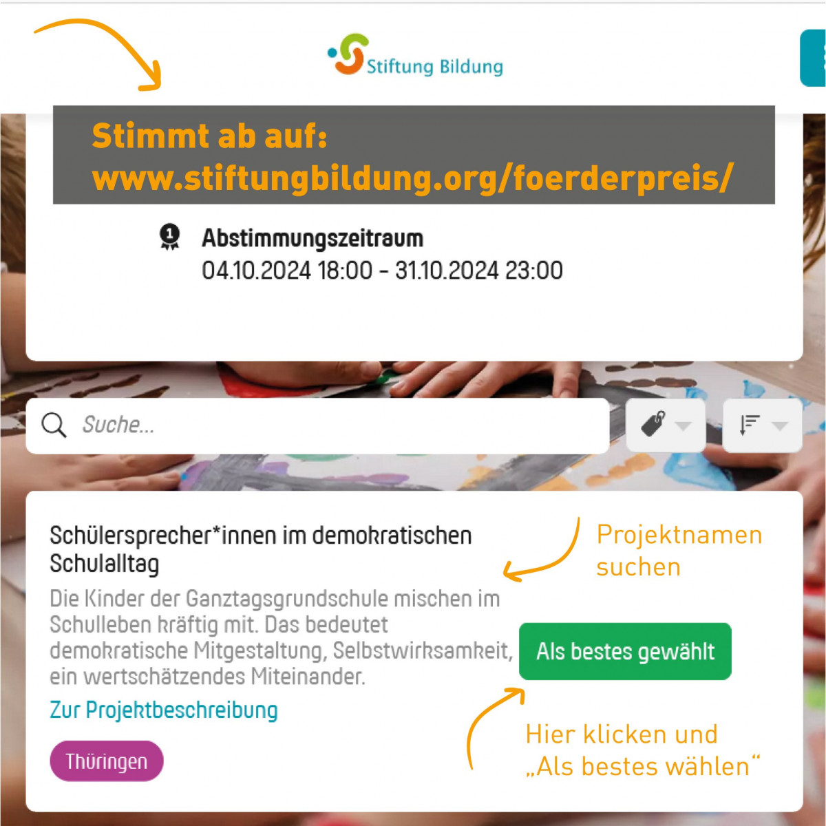 Stimmt für unser Projekt beim Förderpreis »Verein(t) für gute Kita und Schule«