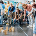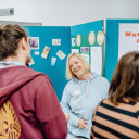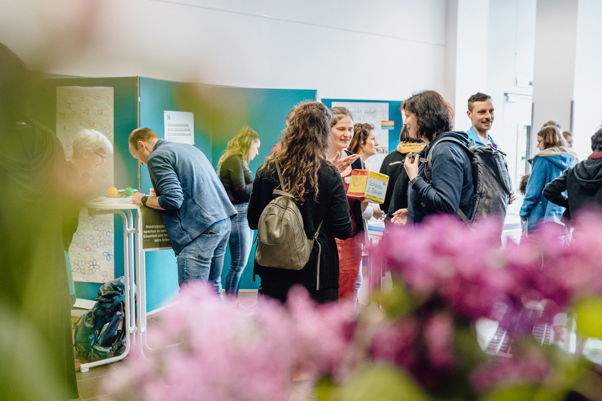Daher stand im Zentrum des QuerWege-Tags eine Messe, an deren 31 Messeständen QuerWegler*innen für QuerWegler*innen über selbst gewählte Themen aus der jeweiligen Einrichtung informierten, zu Diskussionen anregten, Tipps&Tools vorstellten oder zum Mitmachen und Mitdenken einluden. Die Themen waren breit gestreut: von Traumapädagogik und Kinderschutz über die Vorstellung von konkreten AGs und Projekten (z.b. spielzeugfreier Kindergarten, Demokratie-AG) oder die Sammlung von Möglichkeiten für Kinder mit Förderbedarf nach dem Schulaustritt über Geschichten aus unserer Arbeit (Storytelling) bis zu Experimenten, die durchgeführt wurden, Kennenlern-Spiele aus der Grundschule oder das Bewältigen eines Rollstuhlparcours. Die Messe, die zwischen 10 und 13 Uhr stattfand und offen war für Studierende der EAH Jena und der FSU Jena, wurde sehr gut und rege angenommen, der Zulauf war an allen Ständen sehr groß und die Möglichkeit in relativ kurzer Zeit so einen breiten Überblick über unser lebendige Arbeitswelt zu bekommen, hätte nicht spannender sein können.