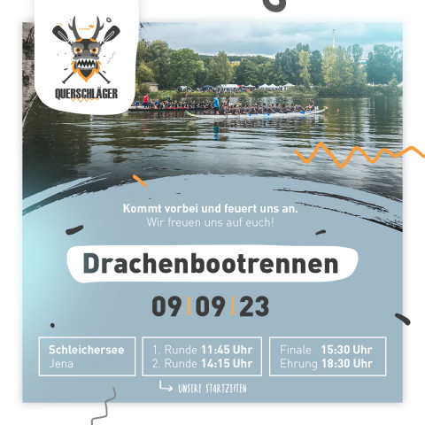 Am kommenden Samstag, dem 9.9., paddeln wieder 22 QuerWegler*innen im »QuerSchläger«-Team auf dem Schleichersee um Ruhm + Ehre (und vor allem für den Spaß) beim diesjährigen Drachenbootrennen – einer Regatta bei der Jenaer Firmen und Vereine gegeneinander antreten.
