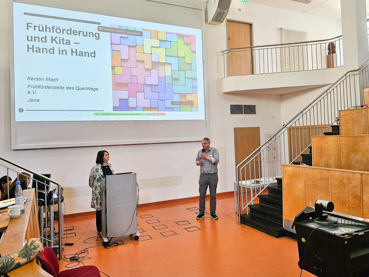 Am 18. Juni 2025 wurde in Erfurt im Auditorium der Helios Klinik diskutiert, wie Frühförderung und Kita-Praxis ineinandergreifen können. Vier Kurz-Impulse gaben den Takt vor: Tobias Thiel zeigte, wo Kitas ohne zusätzliche Steuerungsressourcen an Grenzen stoßen; Kerstin Mieth (Leiterin unserer QuerWege-Frühförderstelle) illustrierte das heilpädagogische Potenzial der Eins-zu-Eins-Förderung; Dr. Michaela Menth ordnete das Ganze wissenschaftlich aus Fachkräftesicht ein; Silke Schellbach stellte »Unterstützerkreise« als gelebte Eltern-Netzwerke vor. Quintessenz aller Vorträge: Erst das Zusammenspiel aus punktueller Frühförderung, alltagsverankerter Kita-Begleitung und systemischer Familienarbeit schafft nachhaltige Teilhabe.