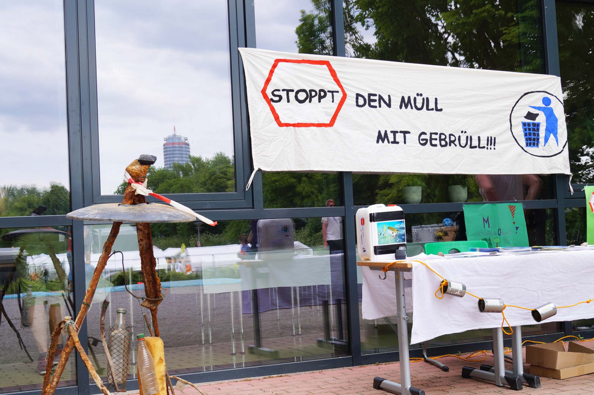 Schüler_innen der Jahrgänge 5 und 6 fanden sich zusammen, um etwas gegen die Verschmutzung der Gewässer, beginnend neben ihrer Schule – mitten im Paradies, zu unternehmen. Sie informierten mit einem selbst entworfenem Banner, Flyer und zogen mit einem Flashmob über den Holzmarkt. Durch ihre vielfältige Kampagne konnten sie 30 Freiwillige für die SaalePutz Aktion, der Bügerstiftung, der Stadt Jena und dem Verein Saale-Vision, aktivieren und so einen kleinen Teil dazu beitragen, das Sterben von Tieren durch Müll, zu verringern. Eine aus gesammeltem Müll gewachsene Plastik schärft den achtsamen Blick durch unseren Alltag. Die nächste SaalePutz Aktion hat schon jetzt einen festen Platz im Schulplan der UniverSaale. Von dem Preisgeld haben die Schüler_innen schon neue Umweltaktionen für unser Paradies geplant. Wir freuen uns drauf!