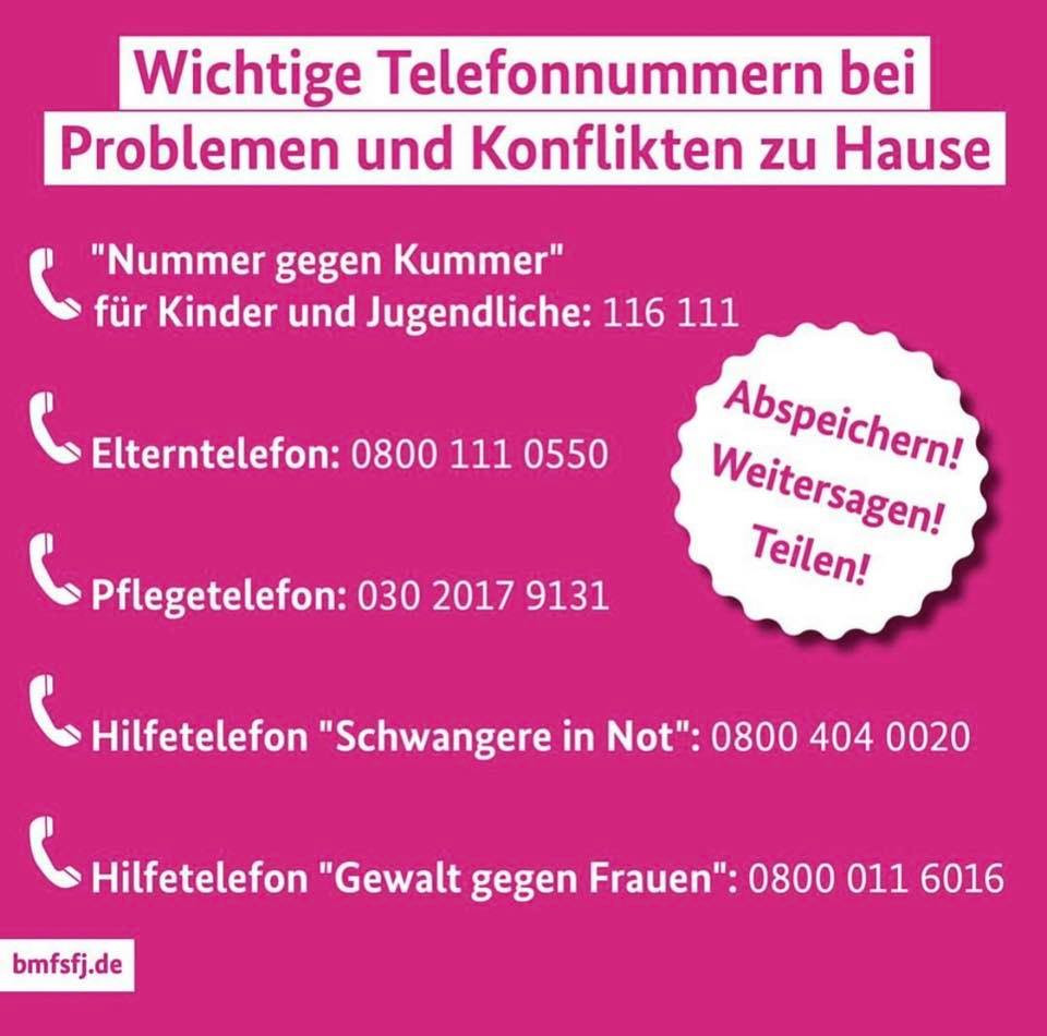 Für alle, die bei schwierigen Situationen zu Hause nicht wissen, wo sie sich hinwenden können finden Sie die Hilfetelefonnummern im Bild. Für alle Eltern, die in der aktuellen Situation Unterstützung für eine gelungene Familienzeit benötigen, bietet der DRK-Kreisverband Jena-Eisenberg-Stadtroda e.V. eine kostenfreie pädagogisch-professionelle Telefonberatung an: Corona Elterntelefon 03641 400 700, Montag bis Freitag von 8 Uhr -18 Uhr.