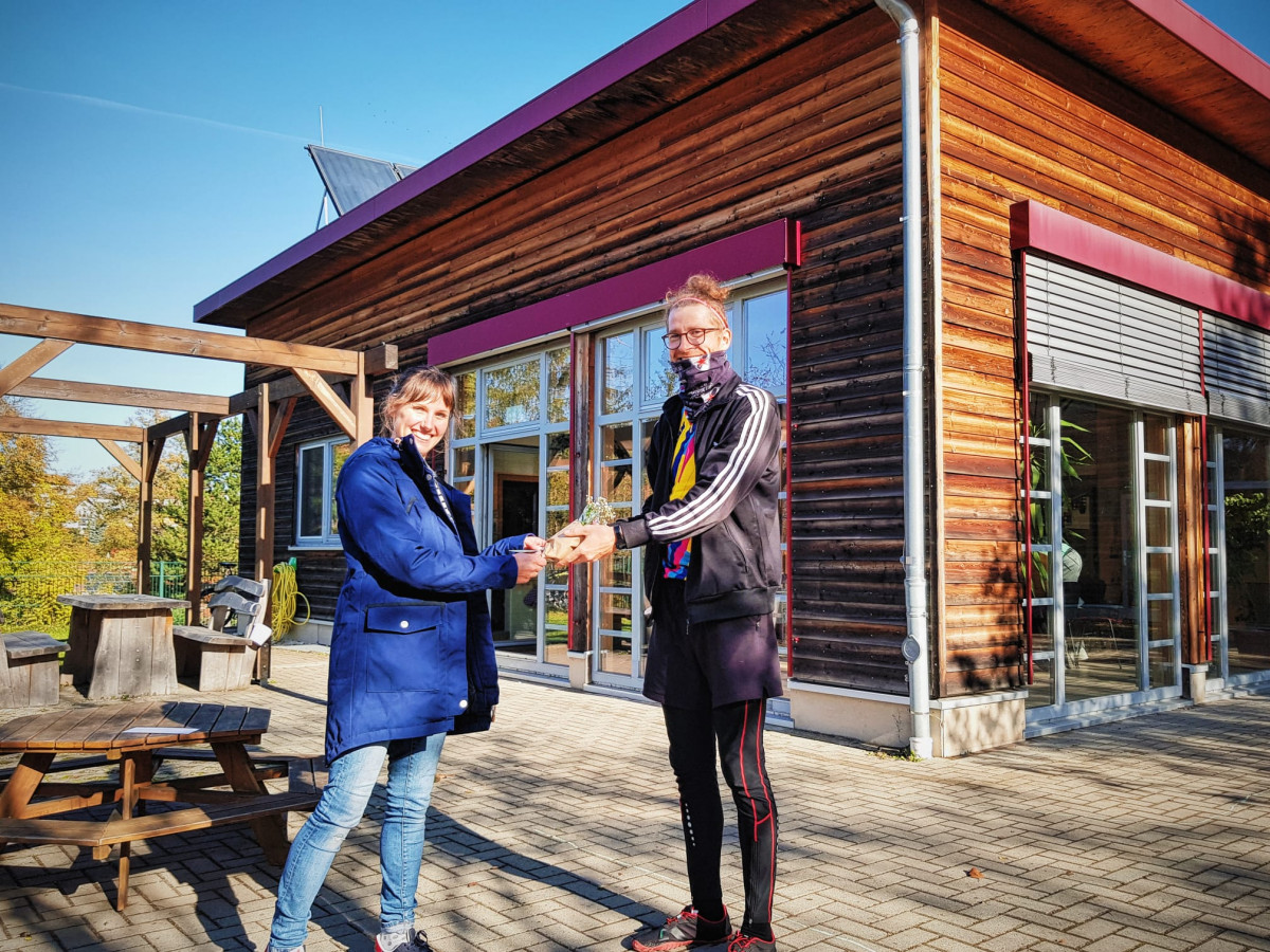 Unser interner Stadtradel-Gewinner 2021 kommt aus der Kita BiLLY. Marko Stolz, Erziehungswissenschaftler und Heilpädagoge und seit 7 Jahren bei QuerWege, hat in den drei Aktionswochen beeindruckenden 1,125km zurückgelegt. Diesen uneinholbaren Vorsprung vor anderen namenhaften QuerWege Vielradler*innen erklärt er mit der Vorbereitung auf seine dreiwöchige Radtour Richtung Spanien, die er direkt im Anschluss im Oktober unternommen hat. Bei dieser Tour, die nochmal doppelt so viele Kilometer umfasste, hat er sogar noch spontan an der »Cyclotour du Léman« bei Lausanne teilgenommen, einem Rennwettbewerb um den Genfer See. Dass ihn seine Reise am Schluss bis nach Barcelona führen würde, hatte Marko anfangs gar nicht geplant, der Verlauf war total offen. Zurück ging es dann mit dem Bus, die Urlaubstage haben sich irgendwann dem Ende geneigt und auch der Körper brauchte Pause. Sein treues Rennrad muss nun erstmal gewartet werden, aber Marko kann zum Glück noch auf zwei weitere Räder zurückgreifen für seinen täglichen Weg zum BiLLY. Nach über 3,200 Fahrradkilometer in 6 Wochen widmet er sich wieder den Kindern und freut er sich über Erholung für seine Beine. Der Büchergutschein ist da ideal zum Entspannen, erklärte Marko bei der Übergabe.