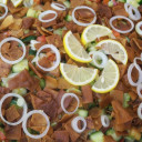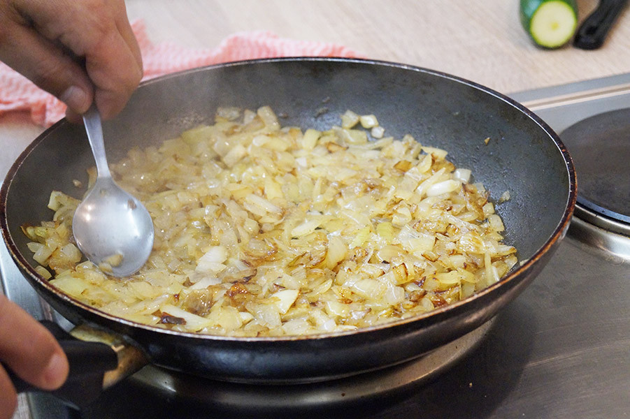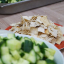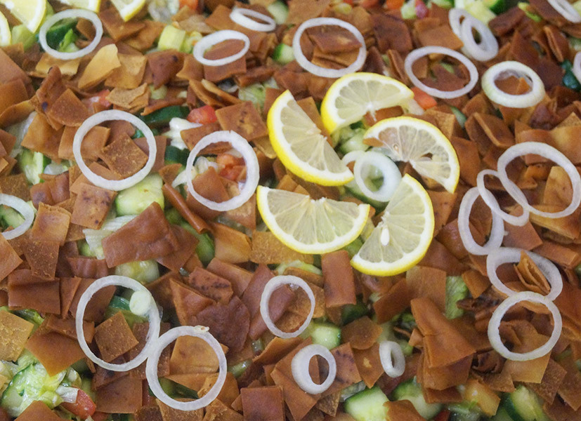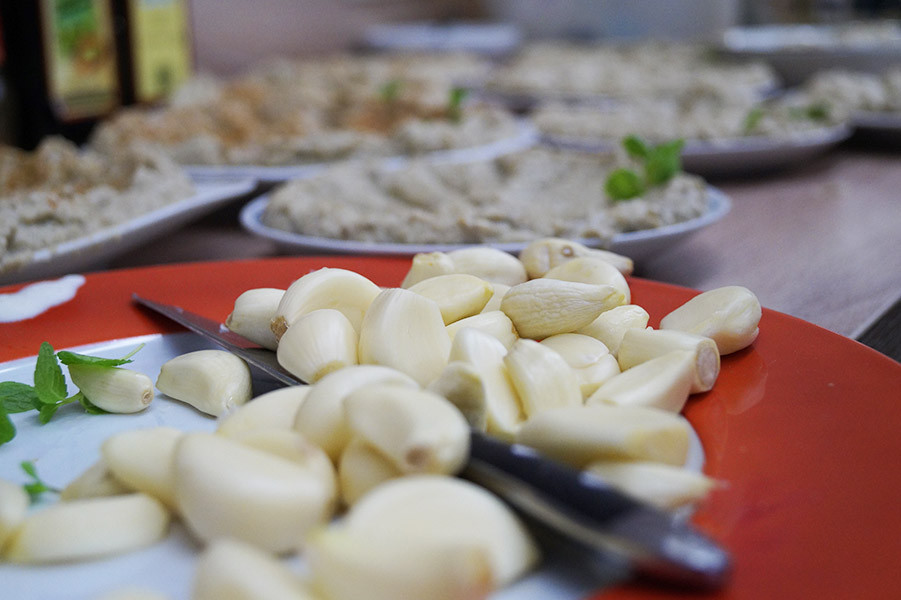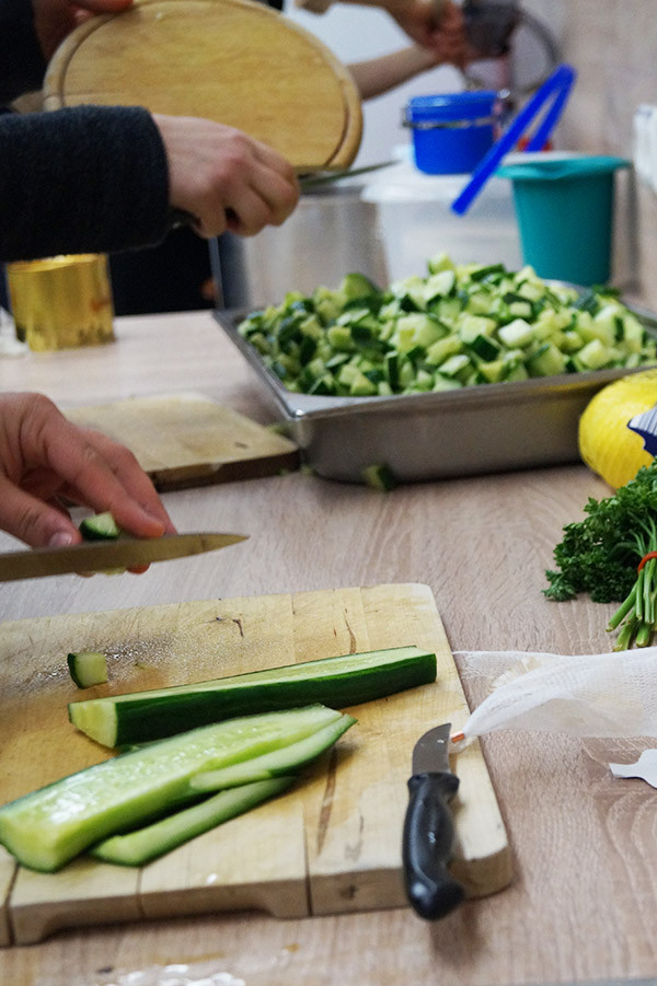 Und wieder hatte der Abend eine ganz eigene Dynamik. Die Schülerküche füllte sich schnell und die „Chefköche“ Nusaiba, Aayat, Omar hatten gut zu tun, uns allen zu zeigen was und wie alles geschält, gewürfelt, püriert und frittiert werden möchte. Trotz der vielen verschiedenen Sprachen gelang die Verständigung nicht nur in der Küche oft ohne Worte mit Gebärden, Mimik und Gestik, dafür aber mit viel Humor. Das gemeinsame Tun stand im Vordergrund und die Stimmung war wie jedes Mal einzigartig. Wir konnten vorleben, wie bei uns ein offenes Miteinander gelebt wird, egal ob Mann oder Frau. Gekocht wurden drei verschiedene syrische Gerichte: Bulgur mit Zucchini, Fattoush (Arabischer Salat mit geröstetem Brot) und Babaganoush (Auberginencreme). Alles war unglaublich lecker!