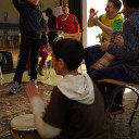 Während die meisten Erwachsenen in der Küche beschäftigt waren, ließen die Musikpädagogen, Stefan Täuber und Mathias Krauß aus dem Projektteam von Steffen Landeck, mit den Kindern die Musik sprechen – Musik die keine Grenzen kennt. Mit viel Freude, kam Bewegung und Rhythmus in die Nichtmitkochenden und die Kinder, die sich mit allerlei mitgebrachten Instrumenten ausdrücken durften.