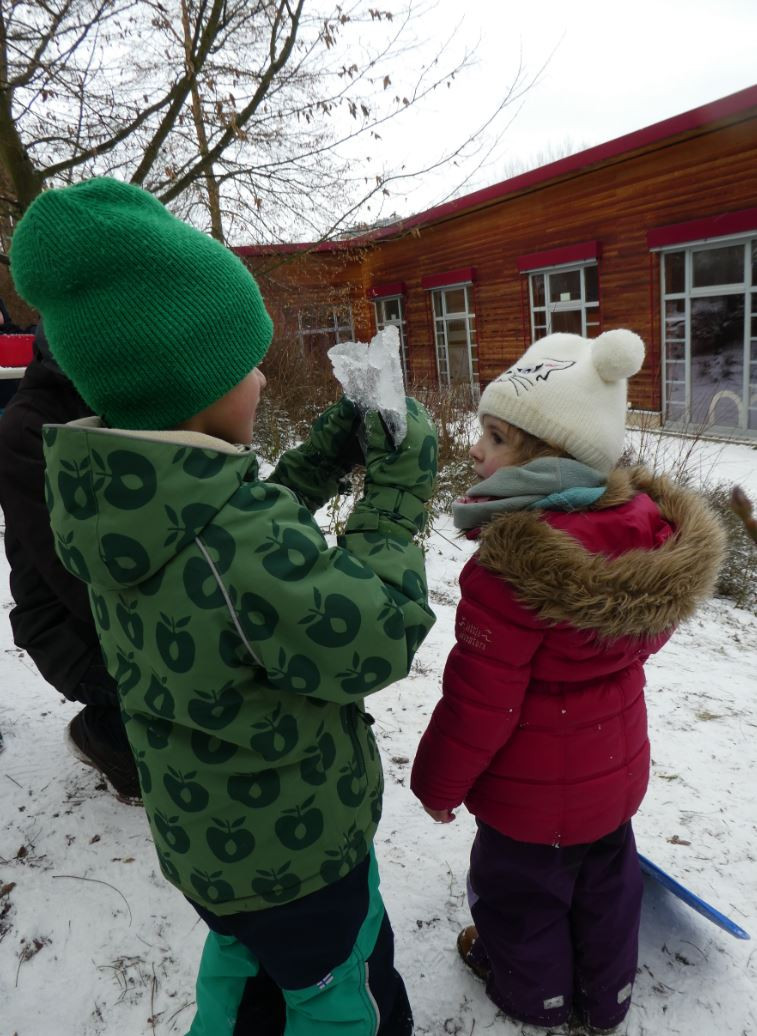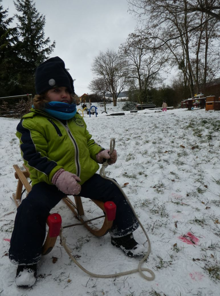 …kommt alle aus dem Haus! Es hat die ganze Nacht geschneit und wir können endlich rodeln gehen. Dick eingepackt haben wir mit unseren Schlitten und Poporutschern im Garten viel Spaß gehabt. Die ersten Schneemänner und -frauen sind entstanden. Die Experimente mit Eisplatten haben uns besonders gut gefallen. Wir freuen uns auf die schöne Winterzeit.