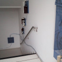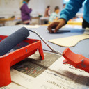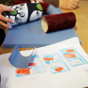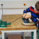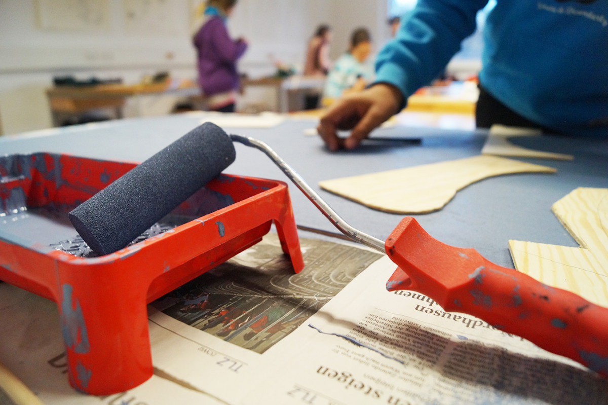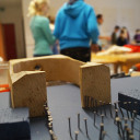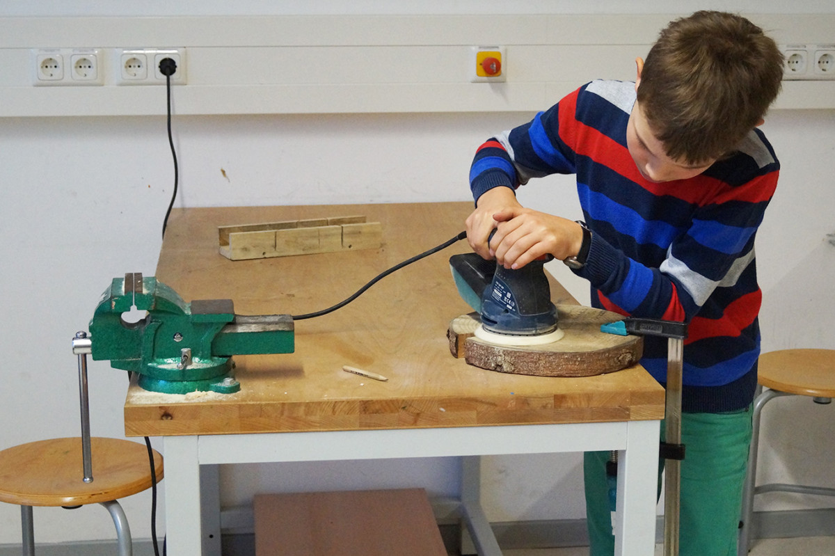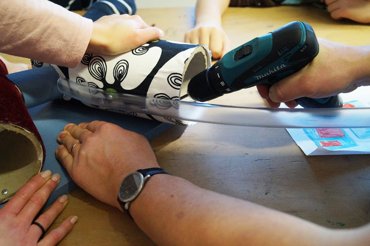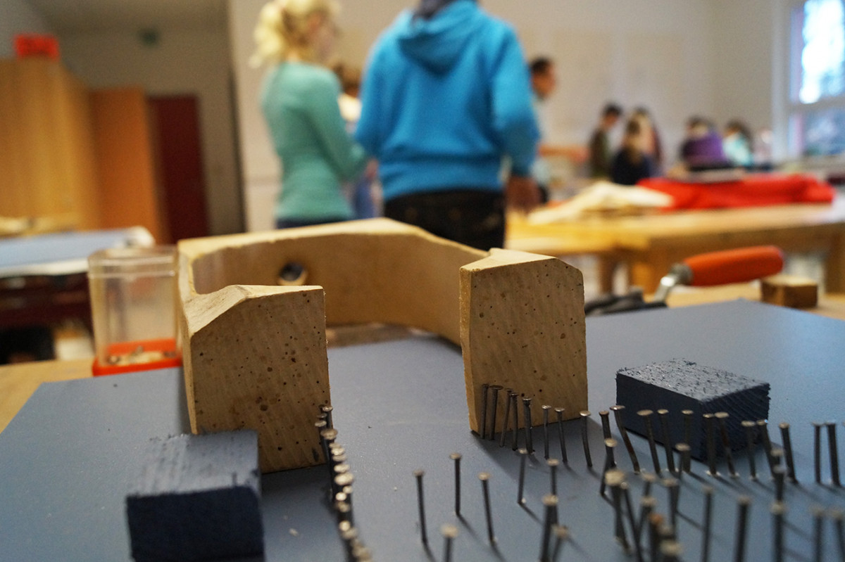 Ein Woche lang hat die Stammgruppe III gefeilt, geklebt, gepinselt, geschraubt, gesägt, gehämmert und gebohrt. Fünf Stunden täglich haben die 19 Schüler_innen, aufgeteilt in sechs Gruppen, an einem Projekt gearbeitet, das ein klingendes Kunstwerk geworden ist. Seit dem 20.11. schlängelt sich eine bunte Murmelbahn durch das hintere Treppenhaus im Paradies, (bald) voll funktionsfähig und Entstehungsort verschiedener Klänge. Die Murmelbahn besteht aus mehreren Elementen, die u.a. aus Holz, Pappe, Kupfer und Schrottteilen fertigt wurden. Verbunden sind die Elemente über einen durchsichtigen Plastikschlauch – passgenau für Glasmurmeln mit 11 cm Durchmesser. Wenn diese nun auf Querwegen durch das Nagelbrett über das Xylophon, durch Kupfer- und Papprohre, Schrottteile und Holzblättchen und über selbstgebaute Trommeln hüpfen, erzeugen sie ein wunderbares Klangspiel. Damit die Kugeln nicht auf ihrem Weg ins Erdgeschoss verloren gehen, sind Plexiglasscheiben auf den Elementen angebracht. Unter der Leitung der Pädagogen Jonas Beetz, Albrecht Lätsch und mit Unterstützung durch die Sozialpädagog_innen Sabine Woratschek und André Güllmar ist auf diese Weise eine tolle Brücke zwischen der UniverSaale und der SteinMalEins entstanden.