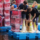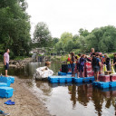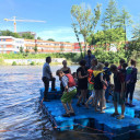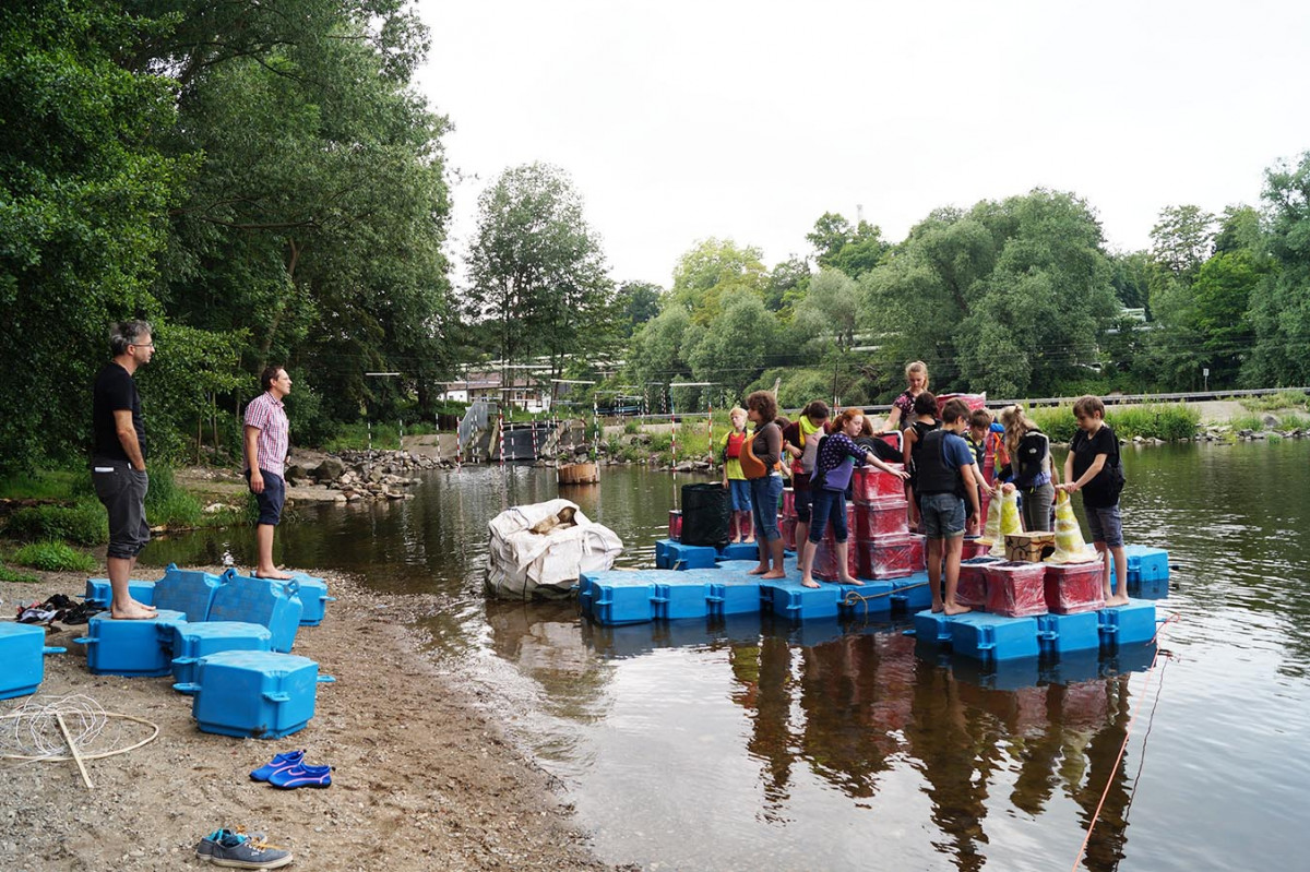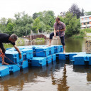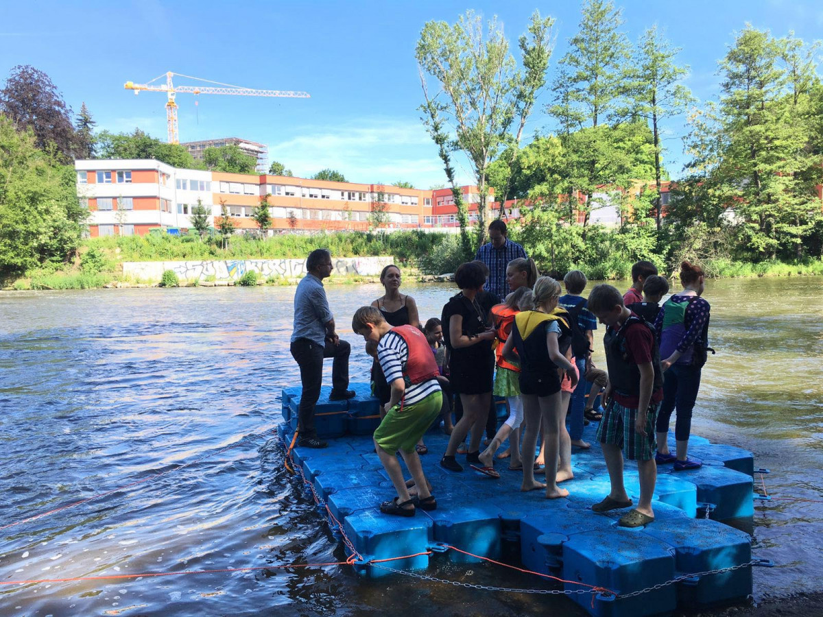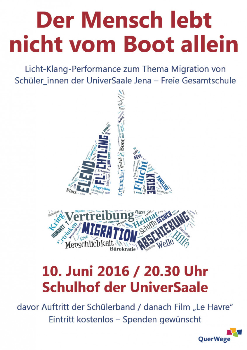 Seit Montag bereiten die Schüler_innen der SG 4 (5. und 6. Jahrgang) eine Licht-Klang-Performance vor, die sich künstlerisch mit dem Thema Migration beschäftigt. Bereits zum zweiten Mal haben sie heute auf einer schwimmenden Plattform auf der Saale geprobt. Die Schüler haben in der Klangfarben-Projektwoche eine Performance kreiert, welche mit Klängen, Formen und Farben spielt und Bezug nimmt auf aktuelle Fragen: Wieviele Menschen können wir aufnehmen? Was passiert, wenn “Fremde” zu uns kommen? Wie kann Integration gelingen? Sie haben sich dafür mit der aktuellen Debatte, Schlagzeilen und Texten beschäftigt und Schlagworte, Metaphern und Phrasen hinterfragt und kreativ aufgearbeitet. In den letzten Tagen sind außerdem Bauelemente und Requisiten entstanden sowie filigrane Friedenstauben. Genannt haben sie ihr Stück “Der Mensch lebt nicht vom Boot allein”. Der biblische Bezug ist kein Zufall und findet sich während der Performance noch an anderen Stellen wieder. Und auch die Kunstform des Triadischen Balletts – die auf den Bauhaus-Künstler Oskar Schlemmer zurückgeht – stand Pate für die Ausgestaltung des Projekts. So ist ein Mix aus Licht, Rhythmus, Requisiten und Gedankenspielen entstanden, der bei Sonnenuntergang erst richtig zur Geltung kommen wird.
