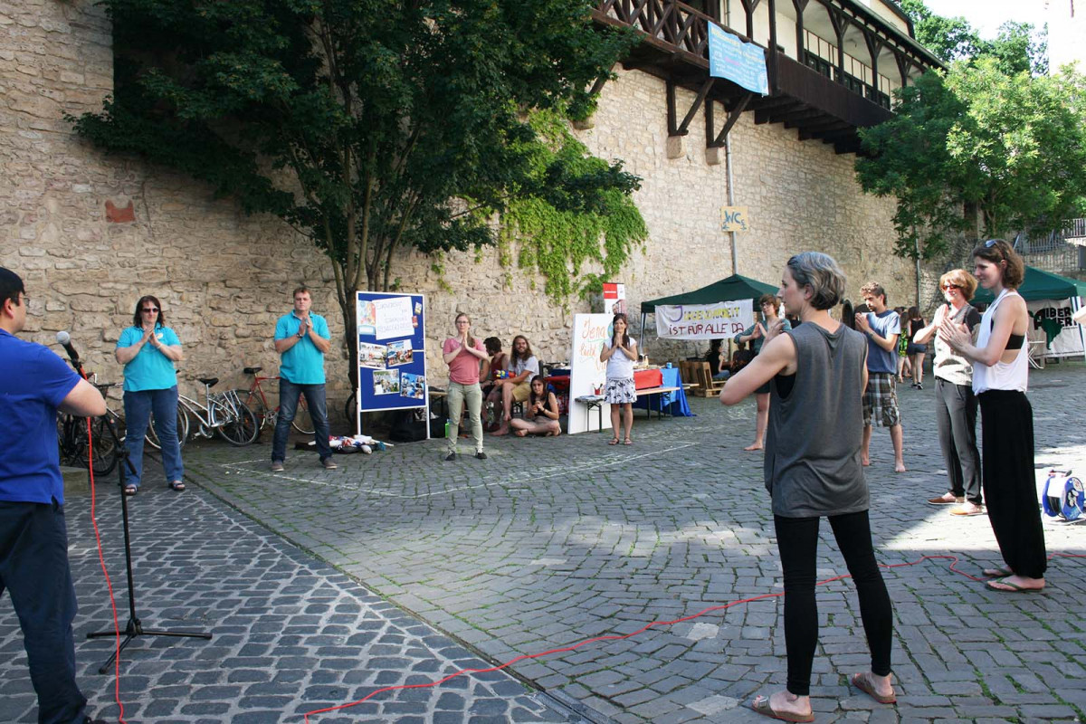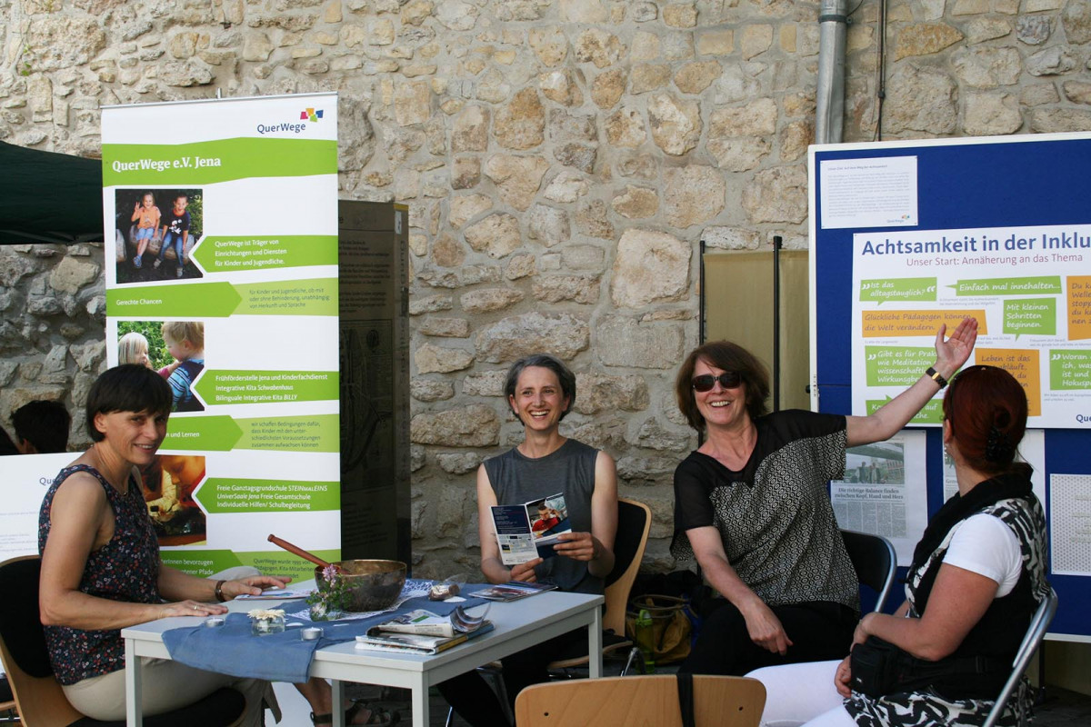 Anke Mamat, Doreen Ruboks-Spangenberg und andere Kolleginnen vom QuerWege e.V. konnten am gestrigen Diversity Tag einen Einblick geben, was für uns Vielfalt ausmacht und wie die 9 Einrichtungen des Vereines diese in Jena mitgestalten. Für QuerWege stand am Tag der Vielfalt die Achtsamkeit gegenüber sich selbst, in einem Berufsalltag beim dem Förderung im Sinne der Inklusion mit intensivem Blick auf jedes einzelne Kind praktiziert wird, im Focus. Und so lud QuerWege den in Peking geborenen Kai Yin ein, der am Faulloch für alle interessierten Chi Gong anleitete, als eine Achtsamkeitspraktik zur Stressbewältigung und dem Umgang mit dem Druck einer beschleunigten Lebens- und Arbeitswelt. Experten setzten auf Übungen und Rituale, die einem stressigen Alltag kraftbringende Pausen bescheren und eine positive Rückkopplung auf unsere Lebens- und Arbeitswelt haben. Für QuerWege heißt das: Glückliche Pädagogen sind die Voraussetzung für glückliche Kinder.