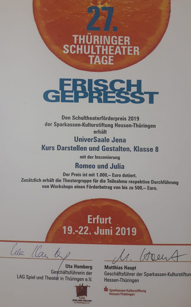 Mit ihrem Stück “Romeo und Julia” machte sich der Kurs “Darstellen und Gestalten” mit der Pädagogin Maren Hädrich in dieser Woche auf den Weg nach Erfurt zu den Thüringer Schülertheatertagen. Neben den neun anderen Schülertheatergruppen setzten sich die 8. Klässler der UniverSaale durch und erhielten den Schultheaterförderpreise 2019 in Höhe von 1.500Euro, vergeben durch die Sparkassen-Kulturstiftung Hessen-Thüringen. Wir sagen Herzlichen Glückwunsch!!!