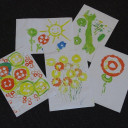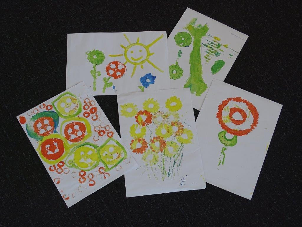 Neben dem Wald-Bus gab es noch eine Malstraße. In der konnten Kinder mit Hilfe von Werkzeugen, Werkstattmaterial und Farben Stempel-Bilder herstellen. Diese wurden im Anschluss an den Tag der offenen Tür zwei Wochen in den großen Informationsrahmen in den Bussen und Bahnen des Jenaer Nahverkehrs ausgestellt.
